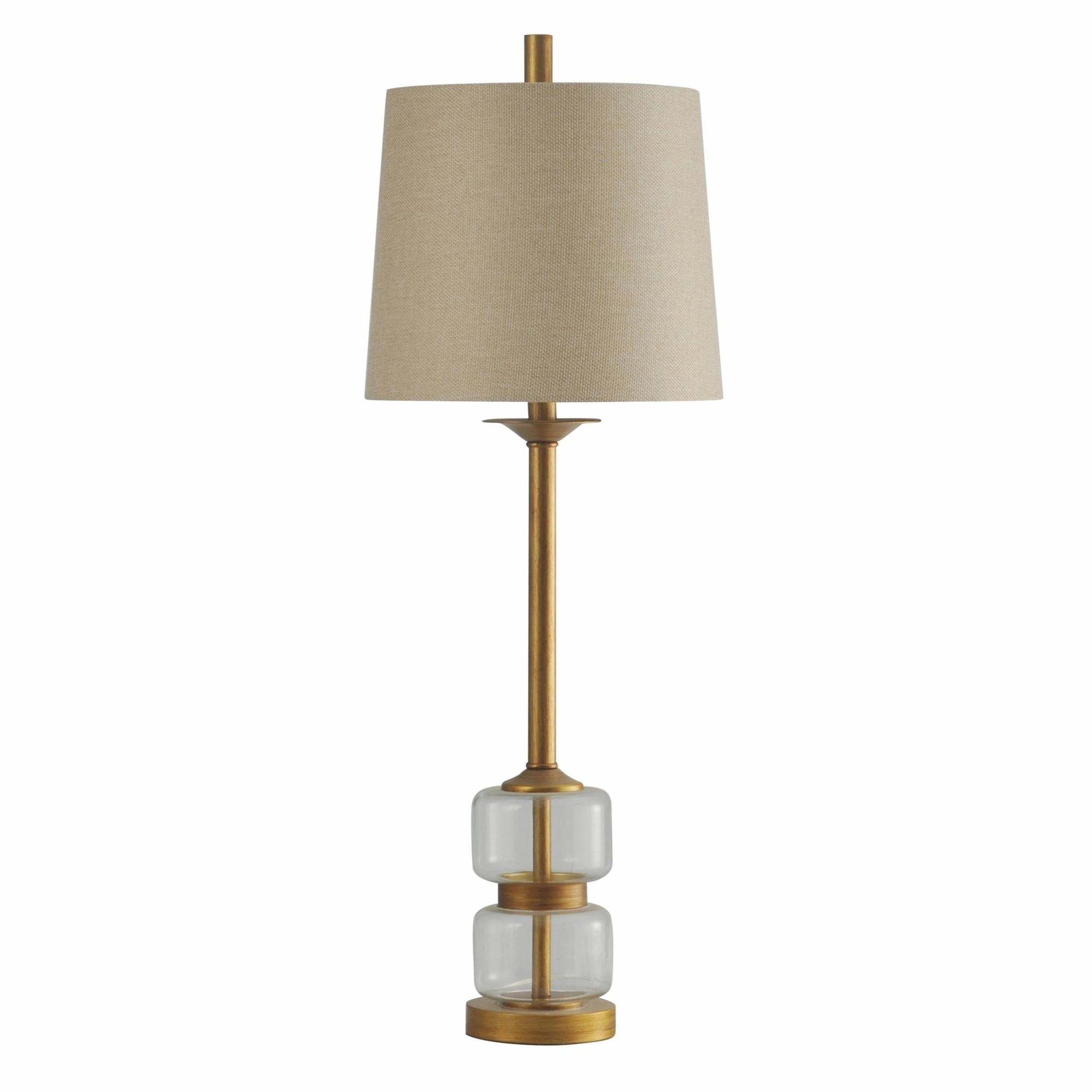 Homeowners who think outside the box need the Midfield Buffet Lamp. The clear glass body is accentuated by the gold metal accents. The aesthetic is complete with a beige hardback fabric shade. Make this piece the newest addition to your living room.