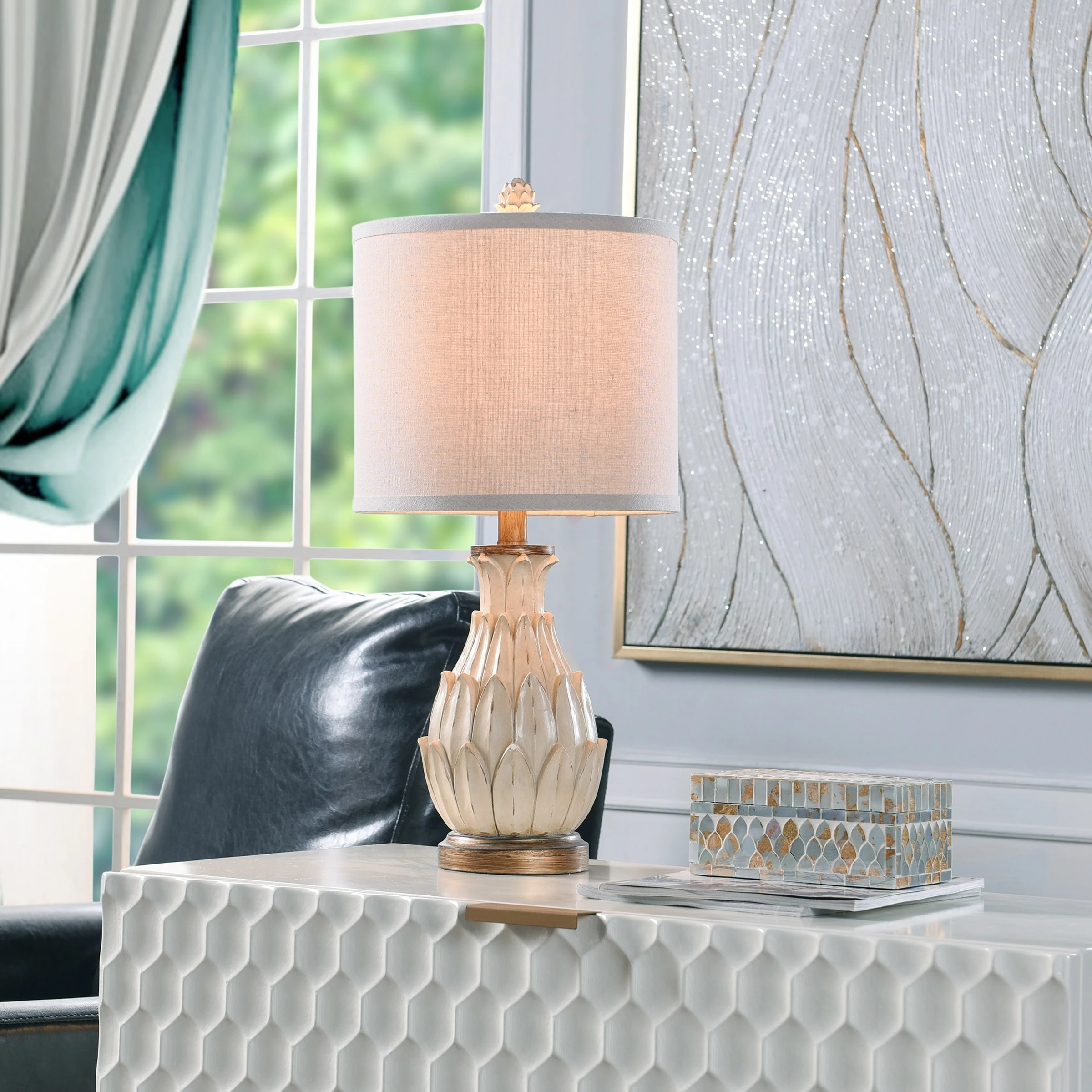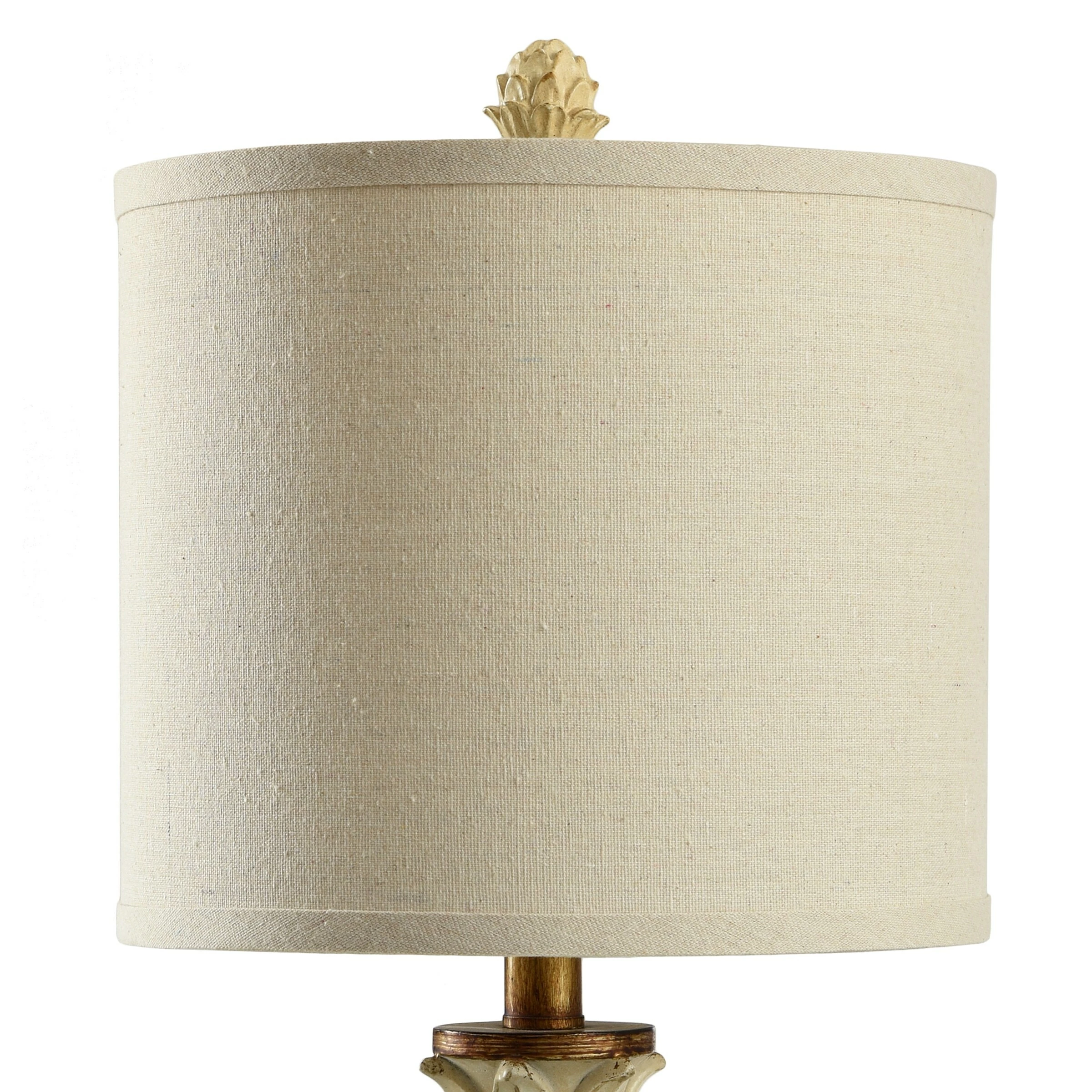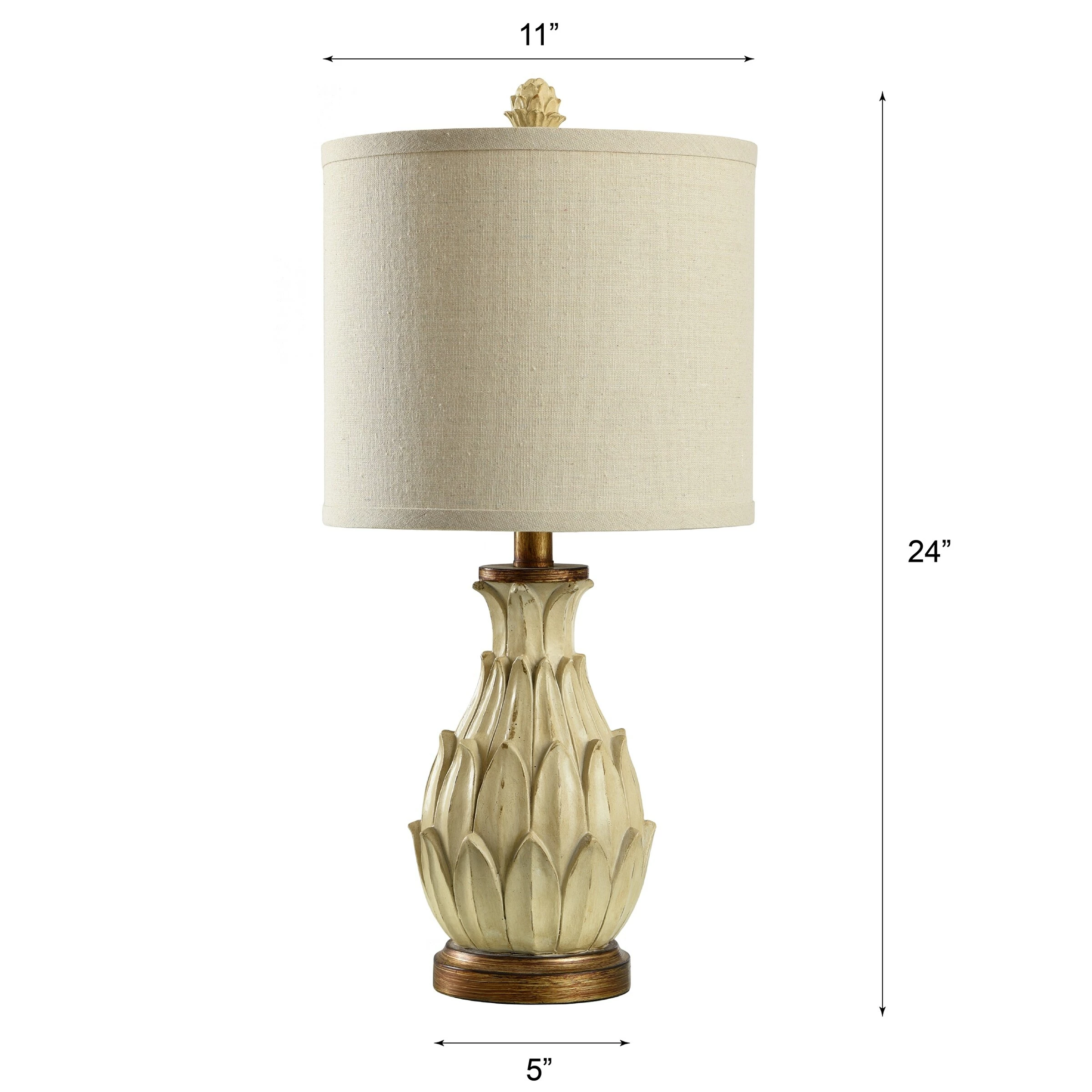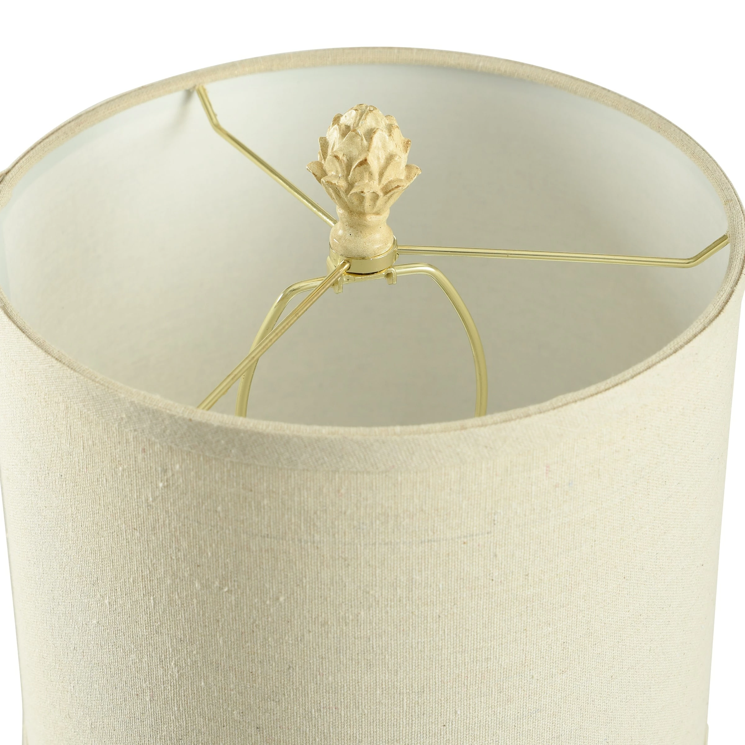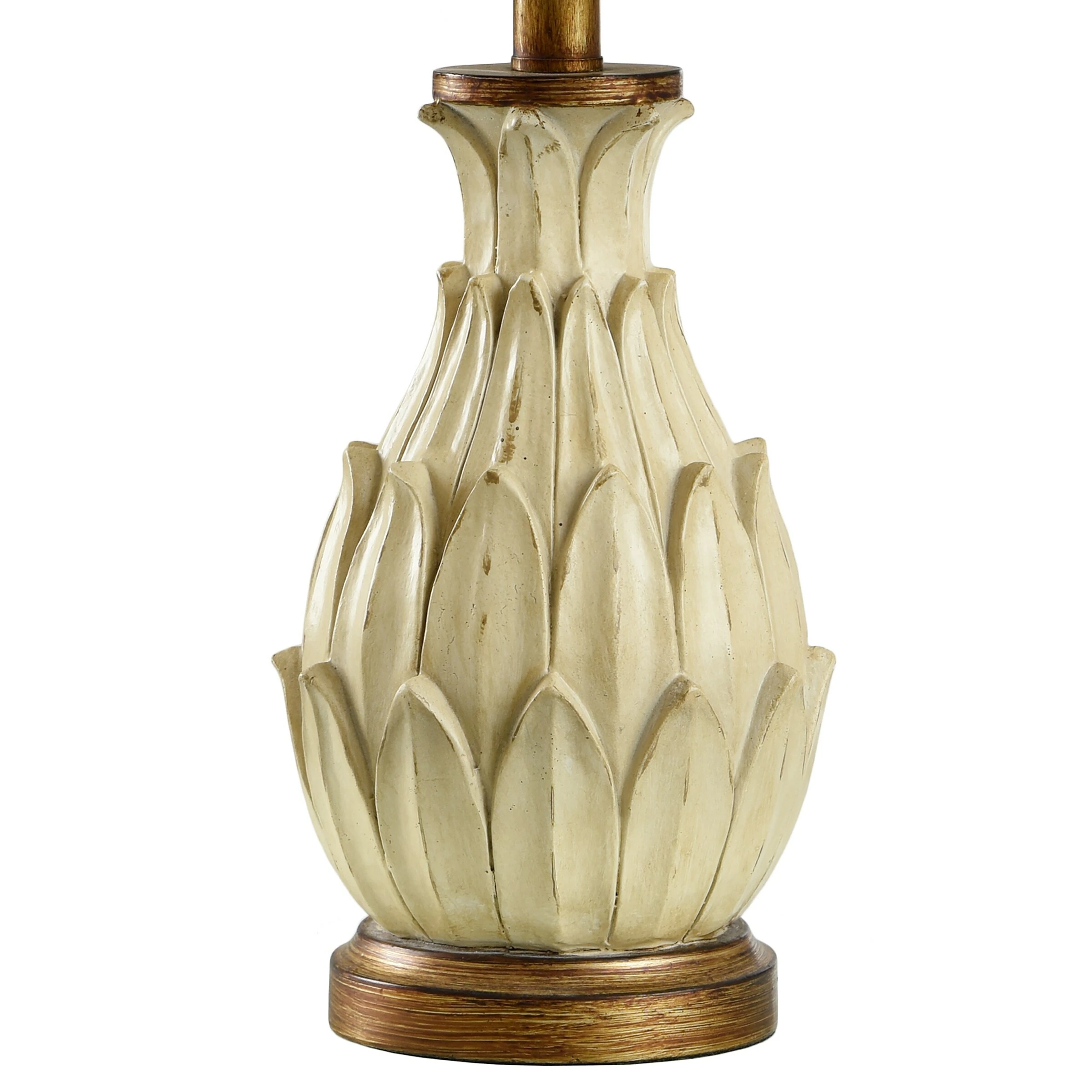 Bring a chic, vintage aesthetic into your dining room with the Mini Artichoke table lamp. The artichoke itself is made out of poly resin, and the finish is incredibly complex with colors of distressed off-white, light beige, dark brown and aged gold. The shade falls into the category of a round drum hardback, so whet your artistic appetite with this stellar piece. A handpainted finish means each piece is unique, with possible slight variations. No two lamps are exactly alike.