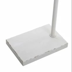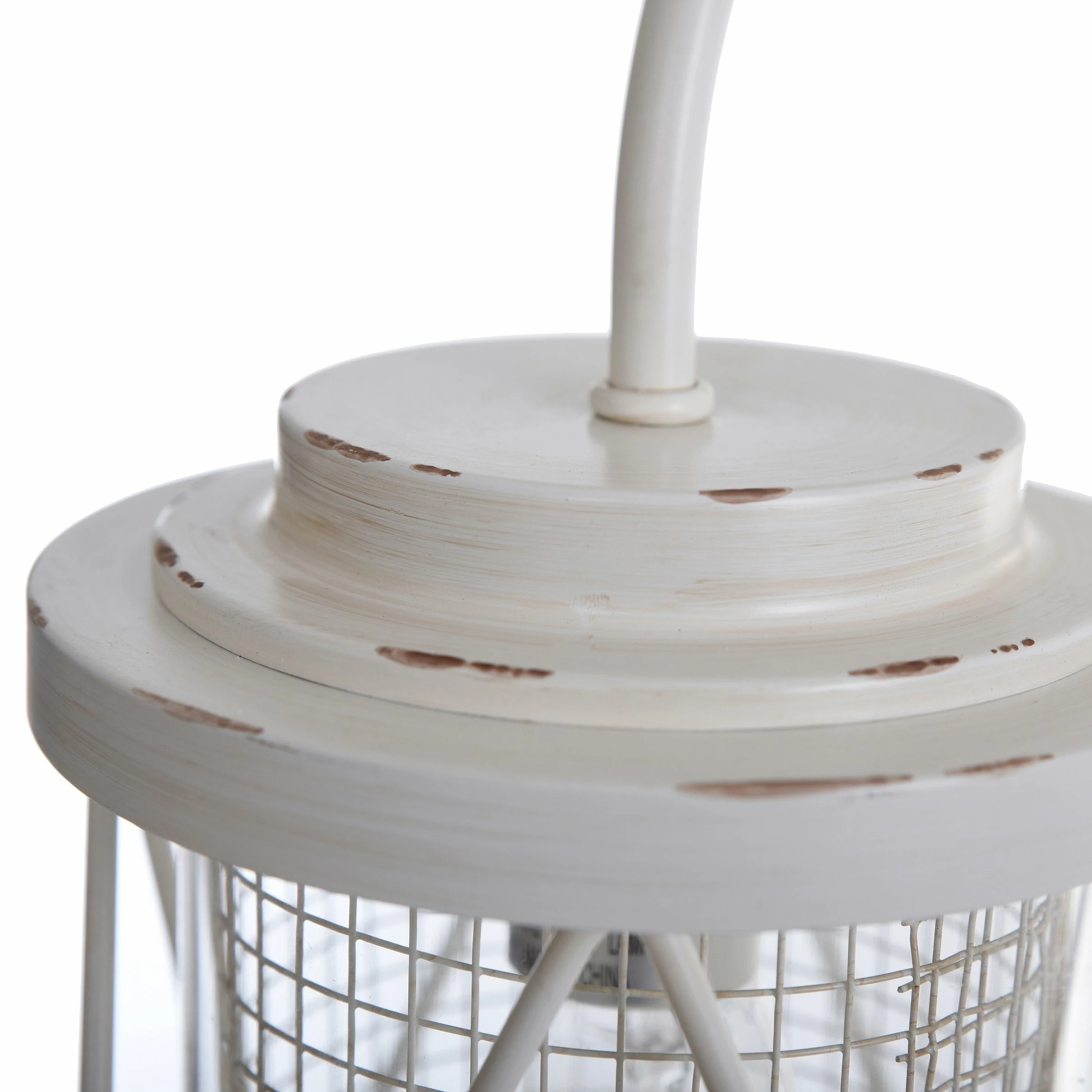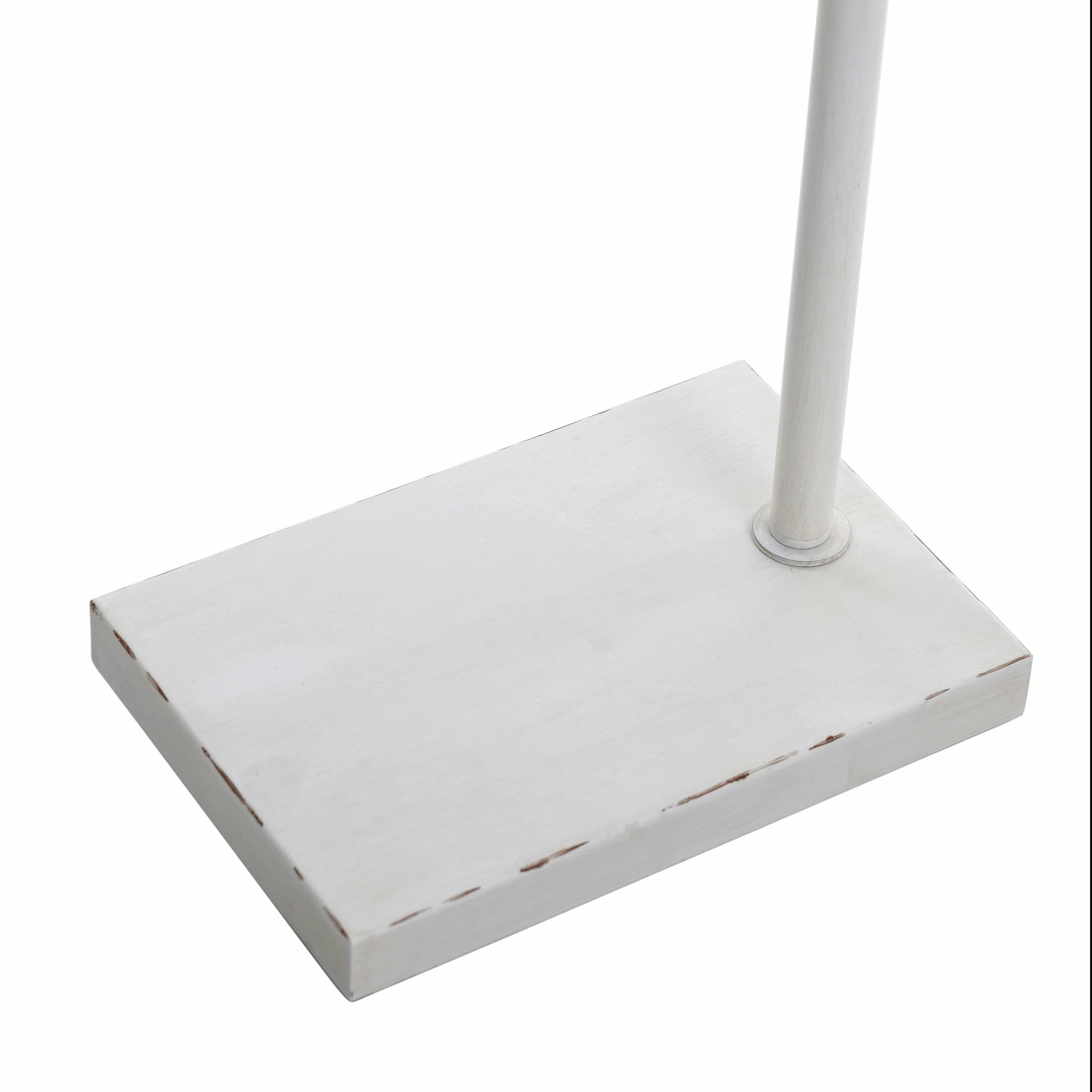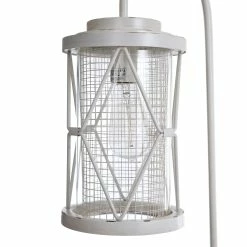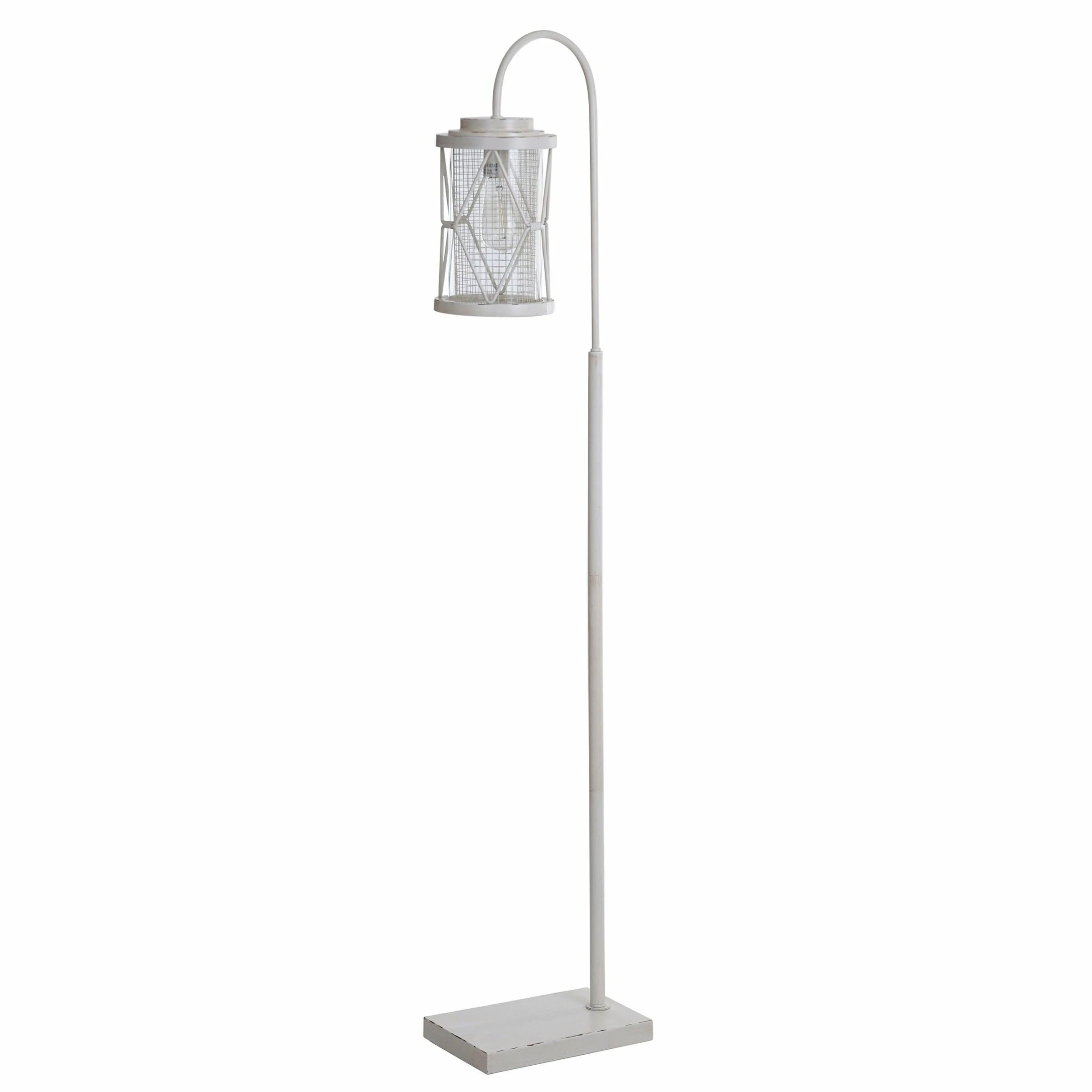 The modern Monterey floor lamp showcases industrial-inspired elements: a white steel base and frame, a clear cord, and an Edison bulb within a white steel wire cage shade. The slim frame has a shepherd pole shape with a curved top that provides a subtle contrast to the rectangular base. With its foot switch, this white floor lamp is easy to operate in a family room or living room.