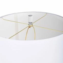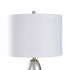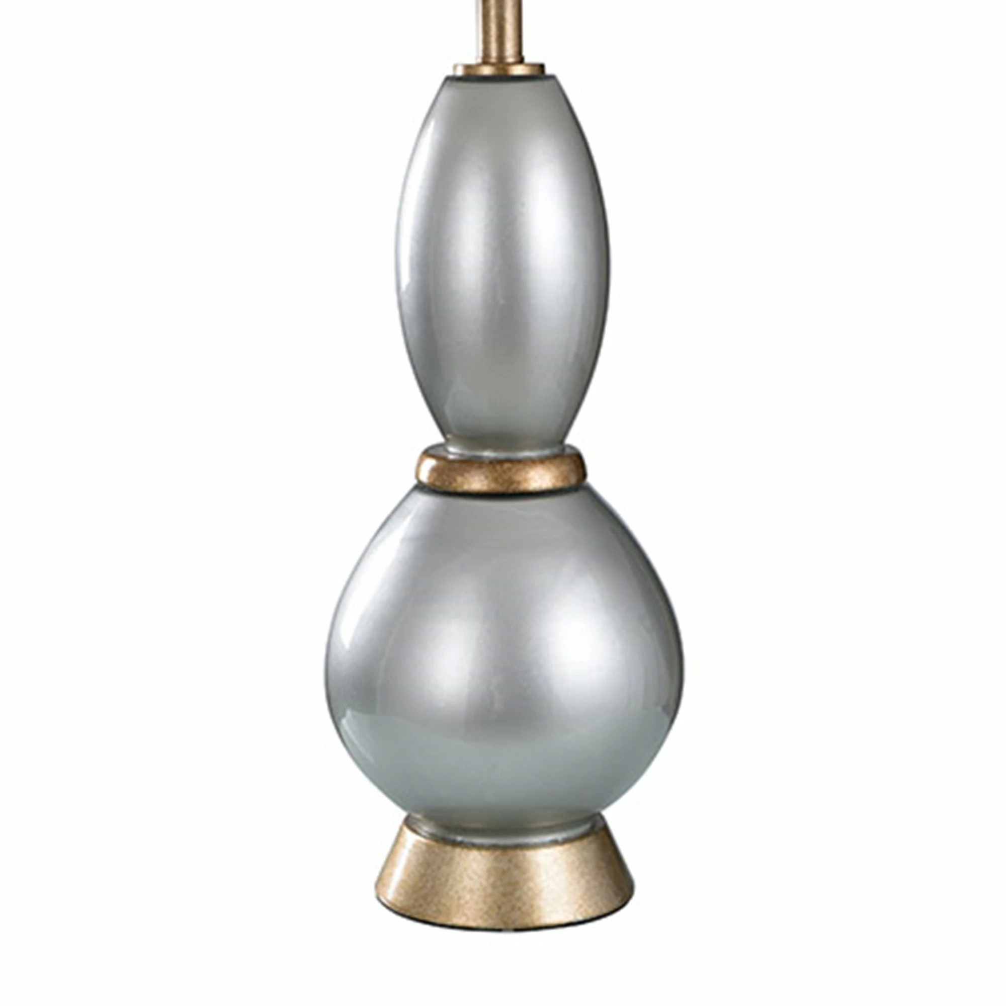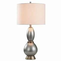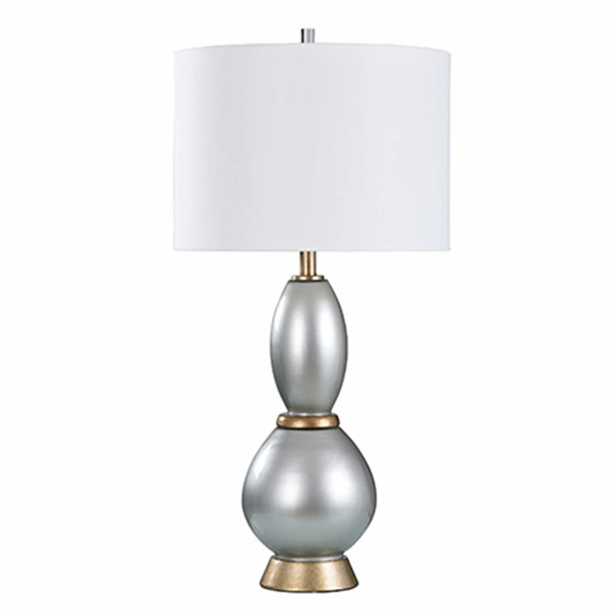 This glass and steel table lamp uses a handsome rounded frame to give any tabletop a new feel. Its combination of a rounded glass and steel ensemble with a classic hardback shade makes it a unique touch. This Table Lamp comes in a nabanil gold and silver steel and glass frame with a gold styrene shade; Requires one (1) 150-watt Incandescent E26 base bulb (not included).