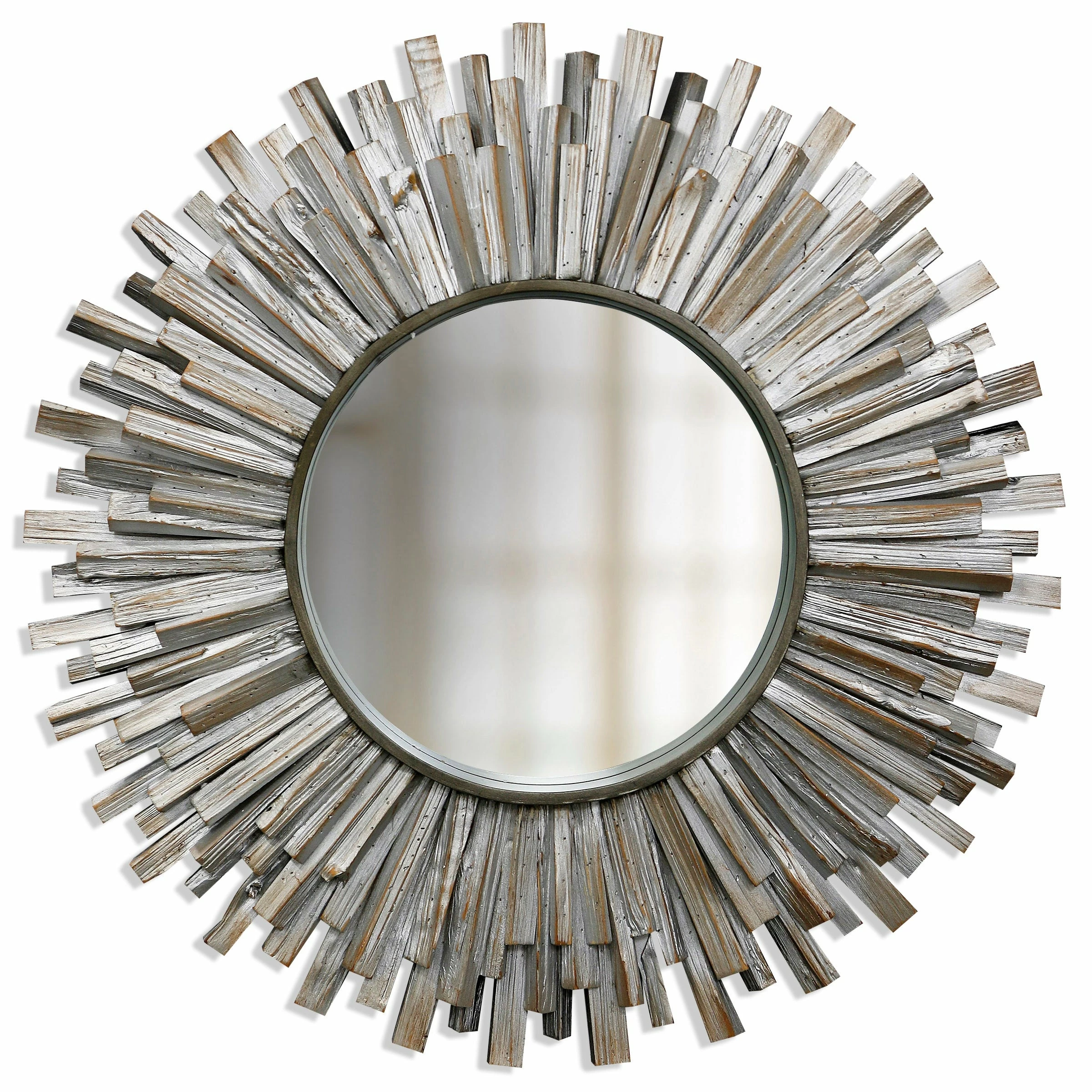 Nothing brings cheery, natural vibes to your home quite like this round mirror with its sunburst frame of weathered driftwood. The circular frame of this mirror is comprised of strips of gray driftwood of varying lengths arranged to form a stunning textured design. Whitewash brushing over the wood brings hints of white and off white to the gray base, making this driftwood sunburst mirror a lovely option for coastal, country-inspired, or farmhouse decor.