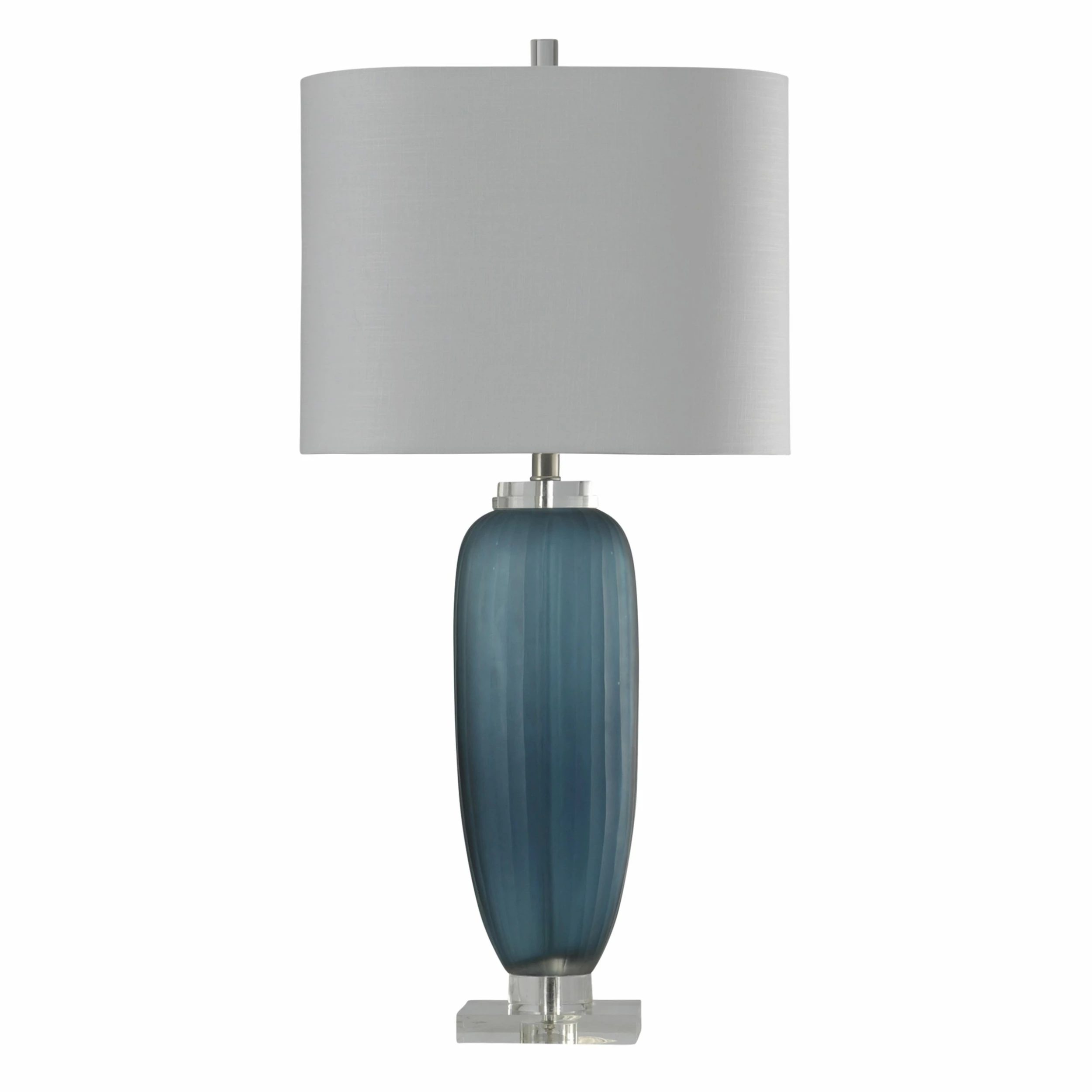 This Table Lamp comes in a nicosia blue glass, acrylic frame with a white hardback fabric shade; Requires one (1) 100-watt Incandescent E26 base bulb (not included).