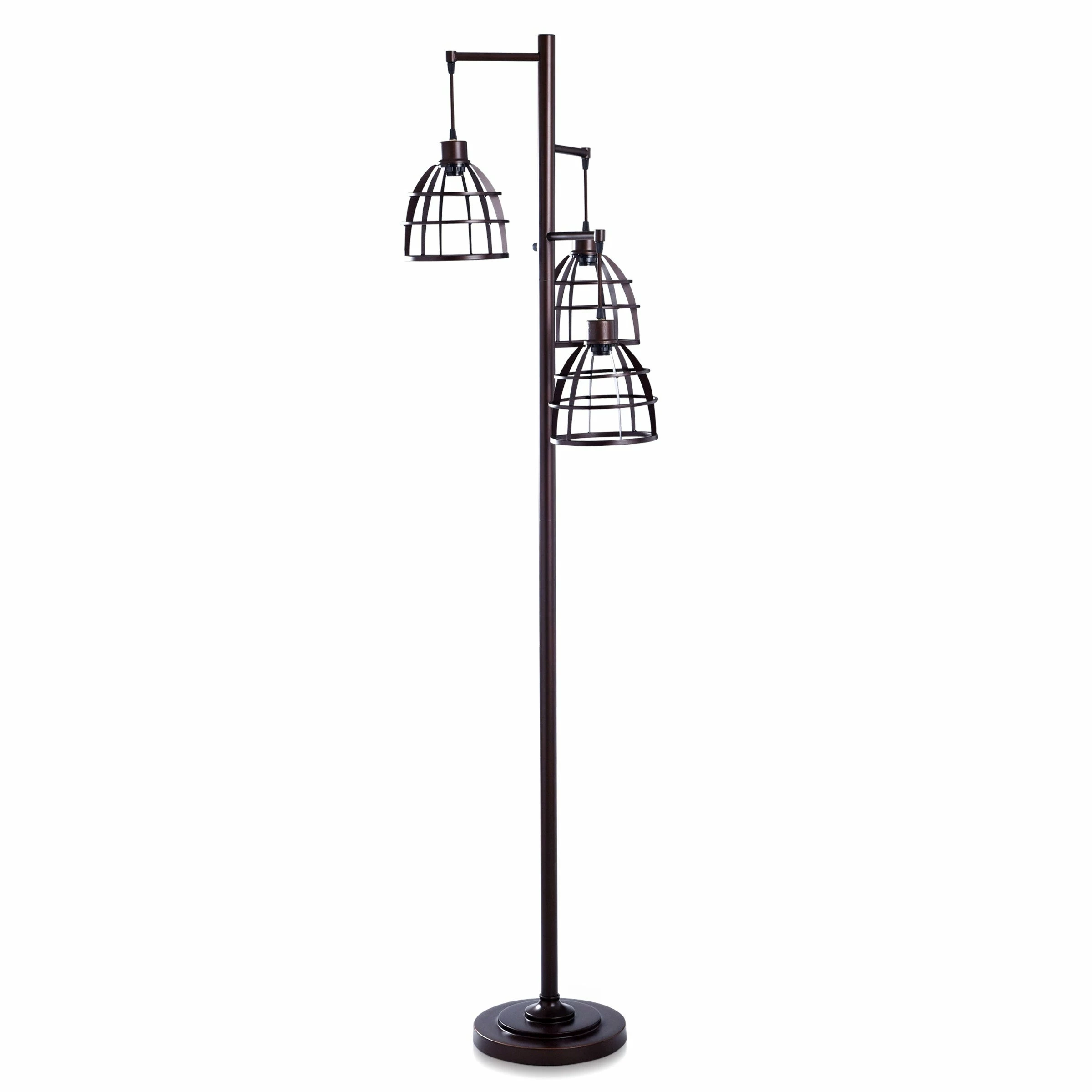 The Niki Floor Lamp is a stunning example of industrial-inspired design with its rubbed bronze metal frame and three lamps of varying heights, each encased in a black metal cage shade. The open metal mesh of each shade allows the bulb inside to be seen, and the different locations of each lamp ensure a wide circle of illumination. Accentuate any residential room with this bronze and black floor lamp.