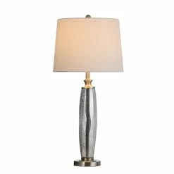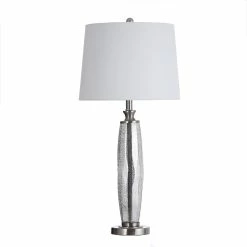 This Table Lamp comes in a mercury glass frame with a white hardback fabric shade; Requires one (1) 150-watt Incandescent E26 base bulb (not included).