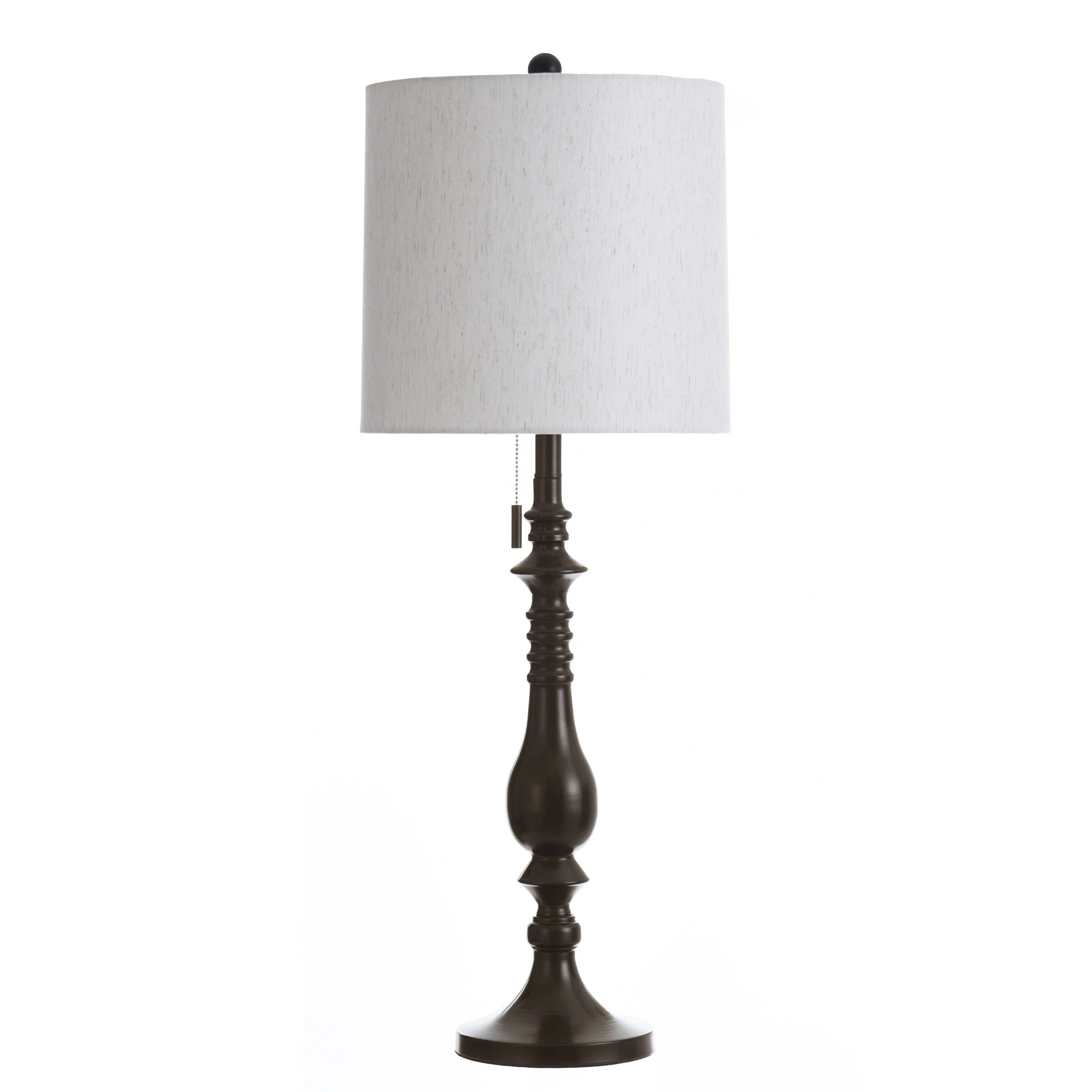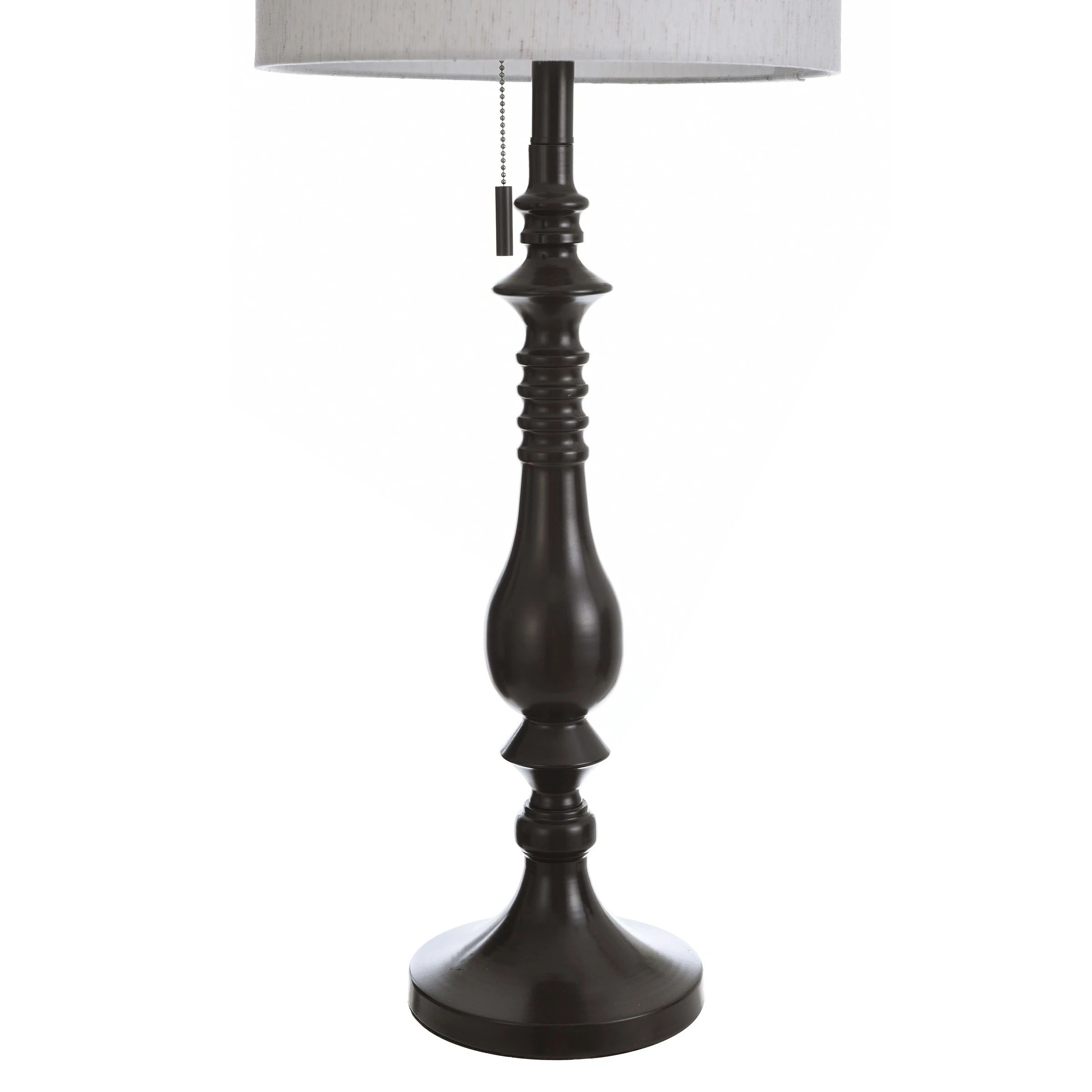This table lamp features a classic candlestick style body and a 3-way pull chain. An oil rubbed bronze finish on the body lends a richly versatile look to this table lamp, which comes topped with a neutral shade. For any accent table, console, or nightstand, this piece will effortlessly update the ambiance.