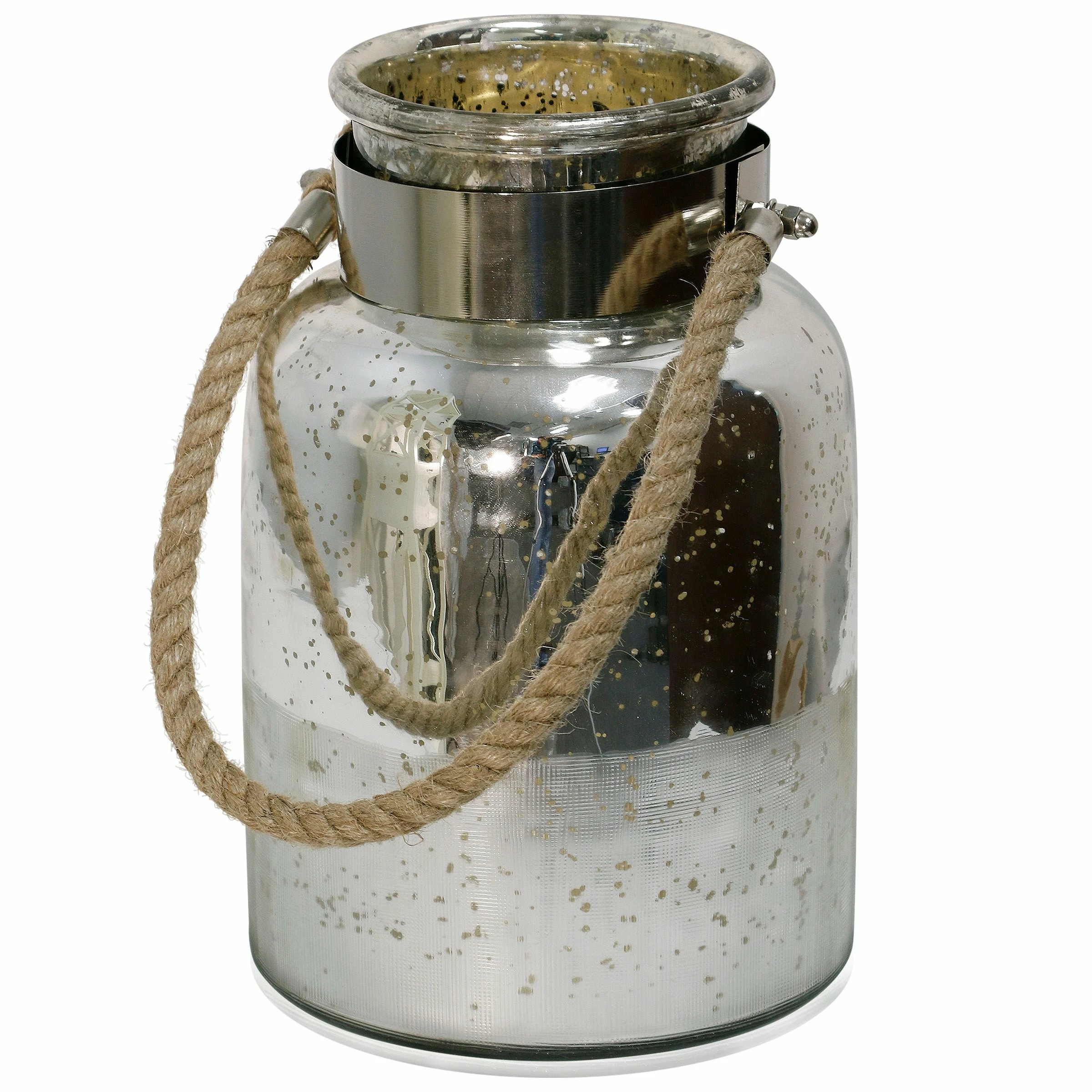 Bursting with farmhouse flair, this half etched glass lantern jar offers a brilliant mix of materials to complement its antique silver finish. A sleek chrome metal band accents the delicate glass, creating an attractive contrast. A rope handle emphasizes the jar’s rustic feel, enhancing the charming aesthetic that makes this piece a fetching decoration for modern living rooms.