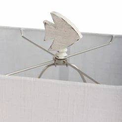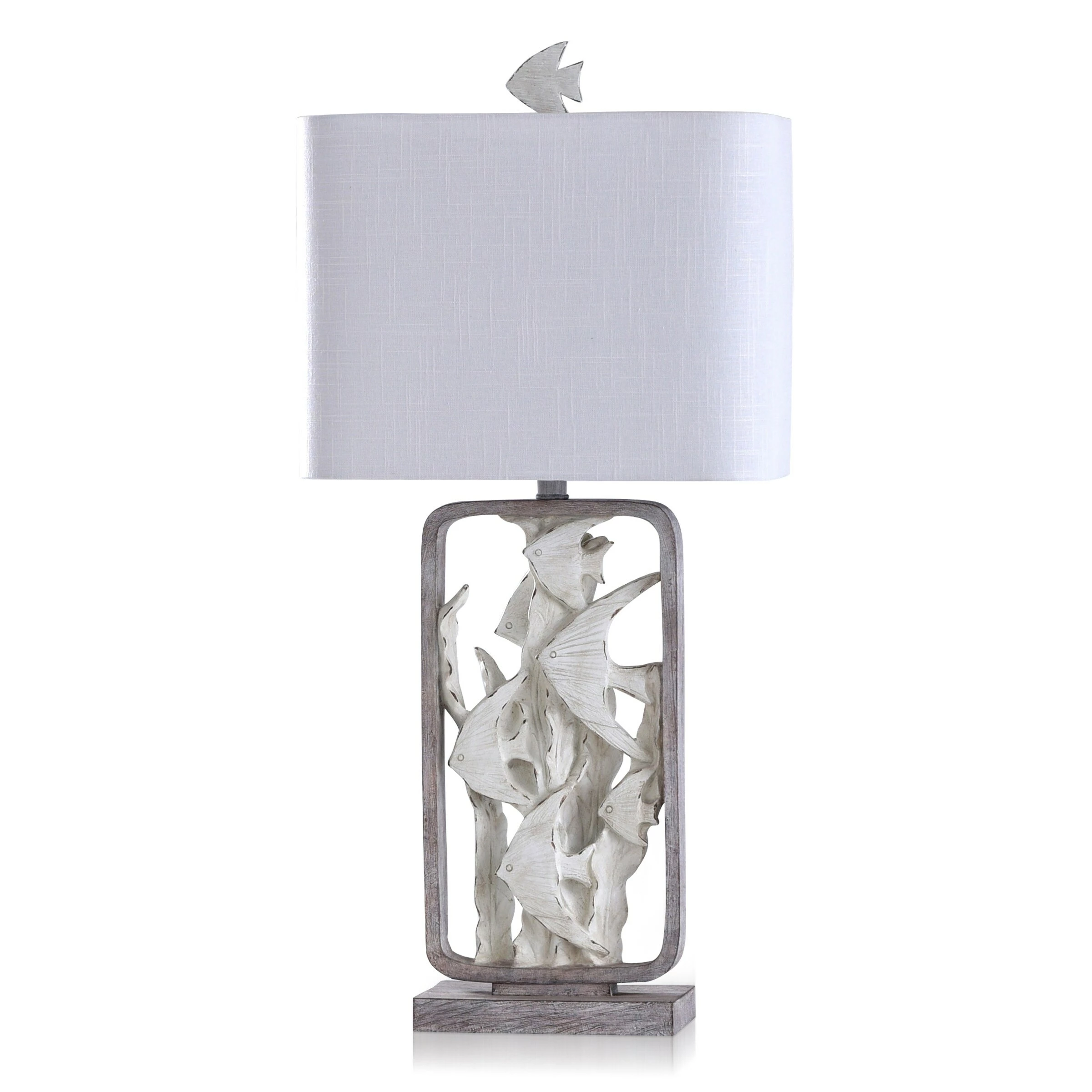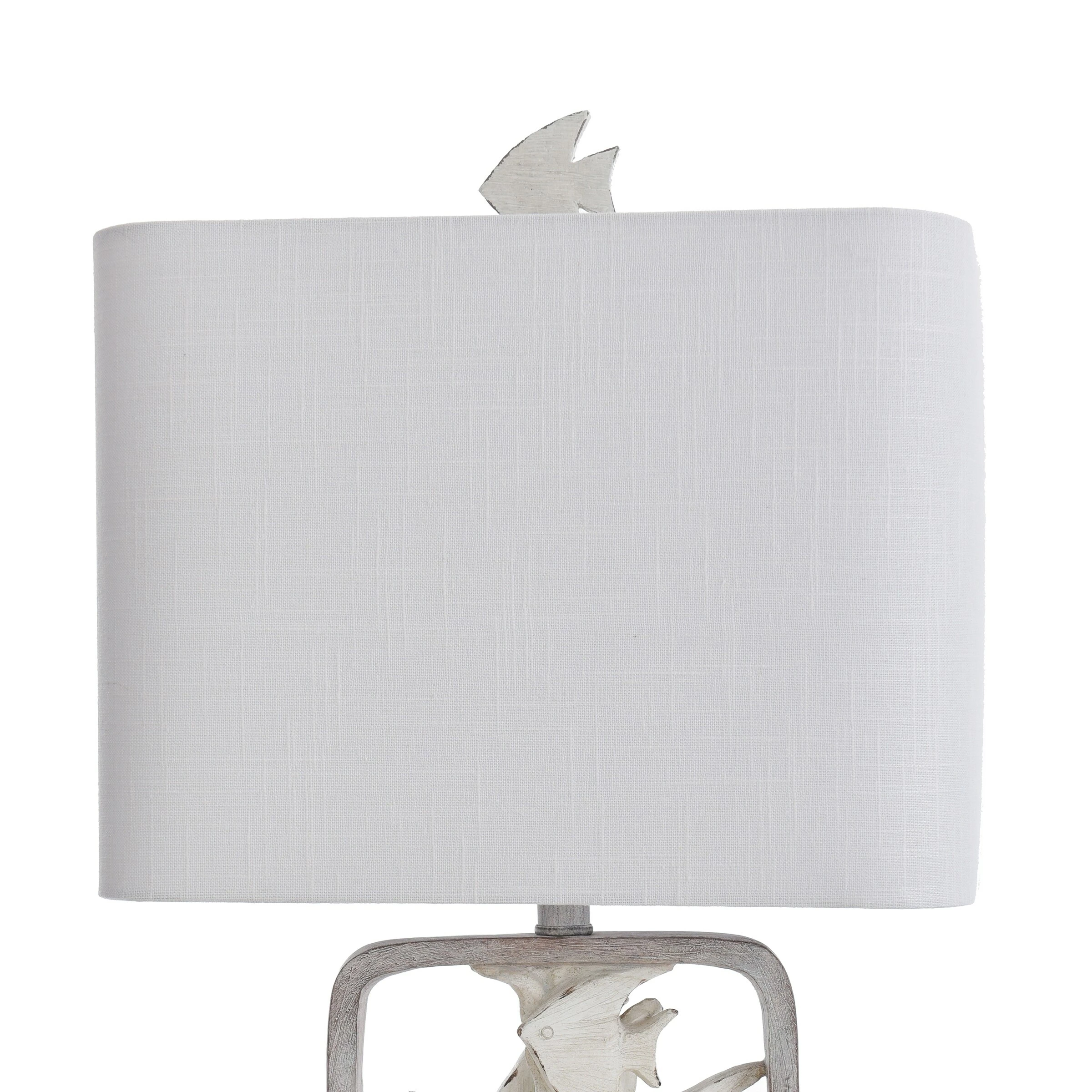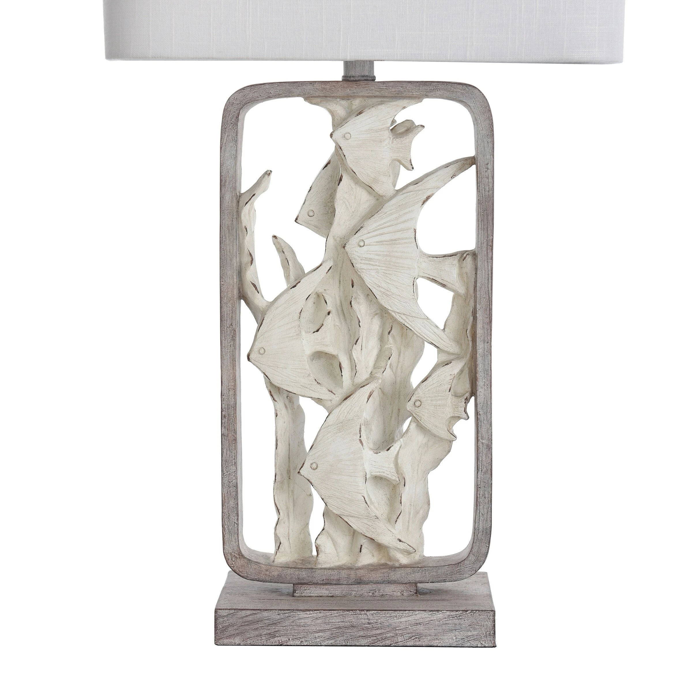 Displaying modern style, neutral colors, and ocean-inspired flair, the Pleasure Reef table lamp has a white shade over a frame featuring tropical fish and seaweed in a two-tone cream and gray finish. Subtle distressing brings a realistic quality to the underwater design. Add this aquatic table lamp to a living room or family room.