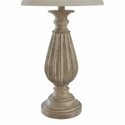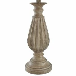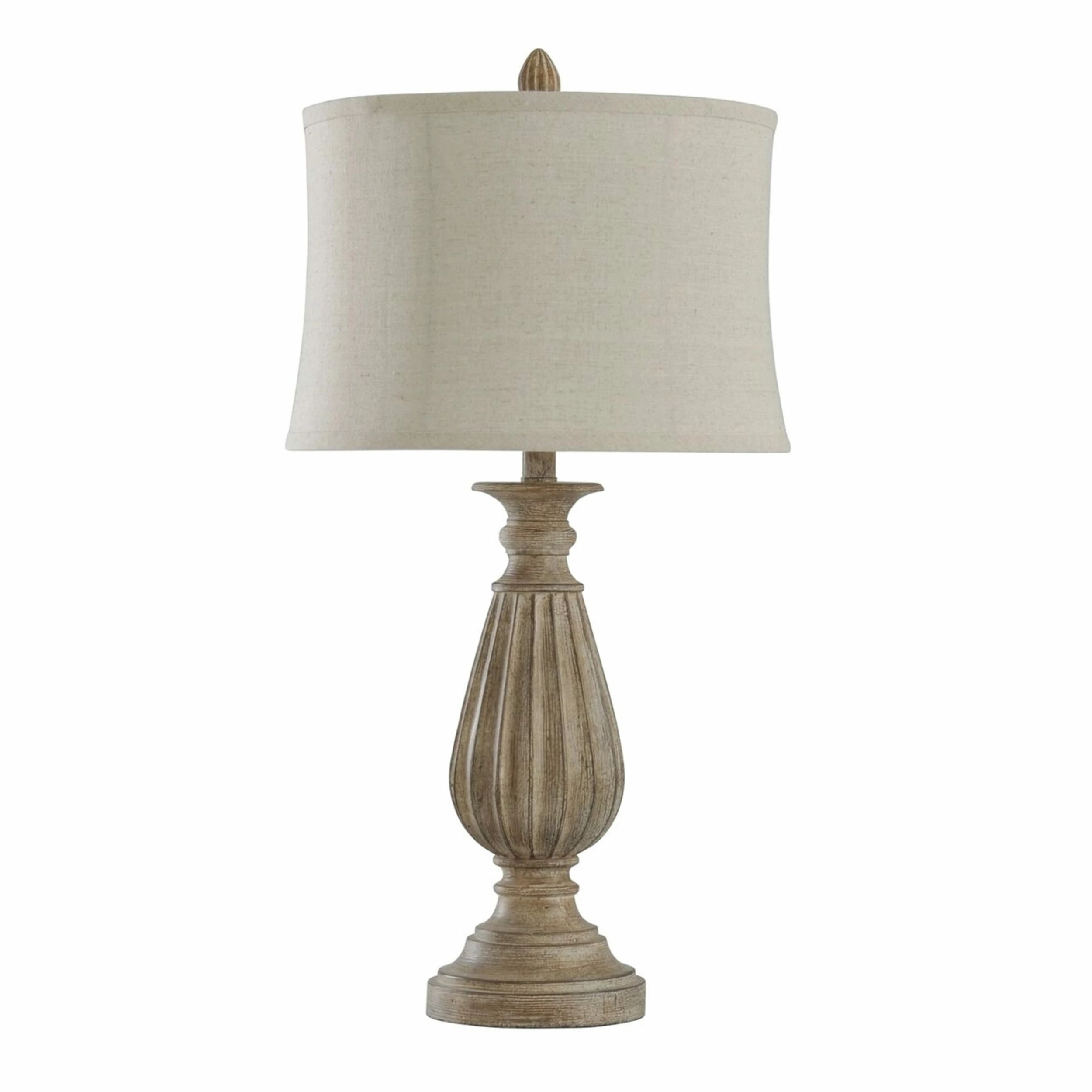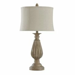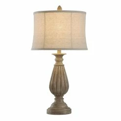 The Poly-Resin table lamp will fit with any other design you have in the family room. It comes with an easy-to-use metal turn knob and round, softback shade. The body comes with a brown finish along with a subtle black tint. A handpainted finish means each piece is unique, with possible slight variations. No two lamps are exactly alike.