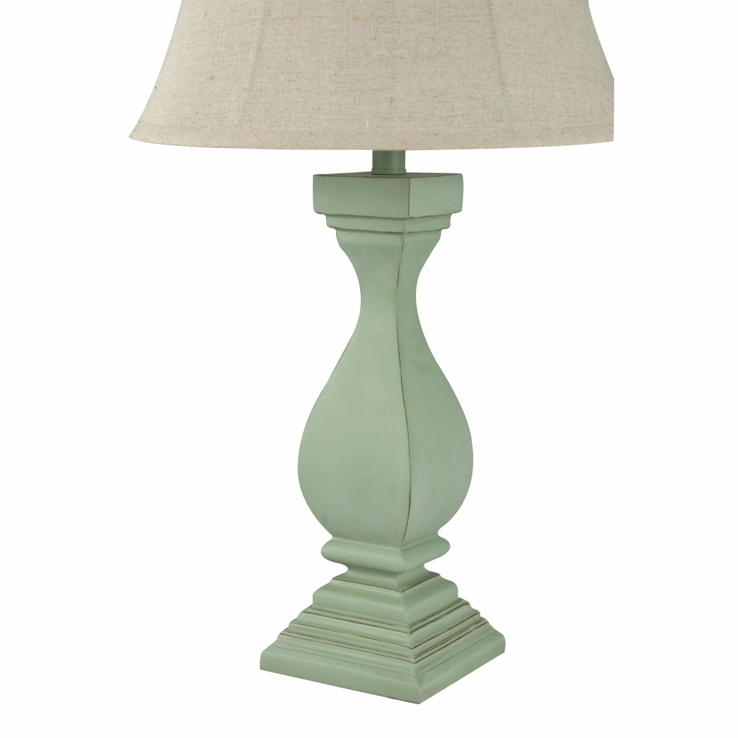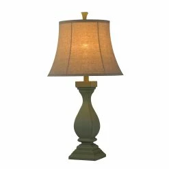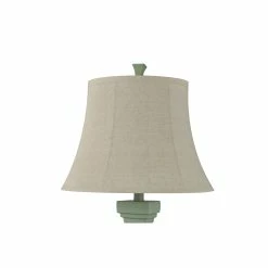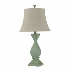 This table lamp comes in a sea grass green (distressed) finish with an oatmeal shade; Requires one (1) 100-watt Incandescent E26 base bulb (not included).