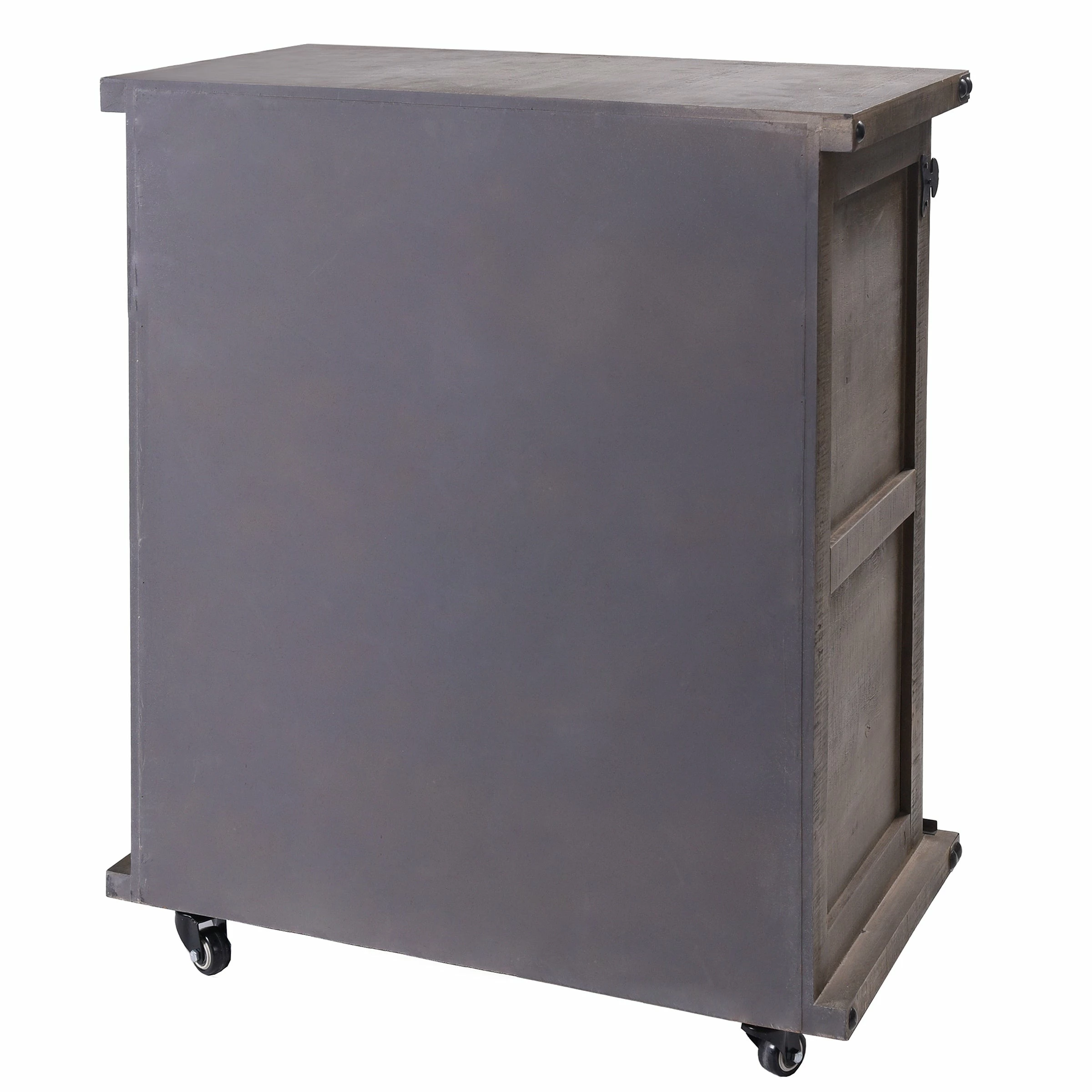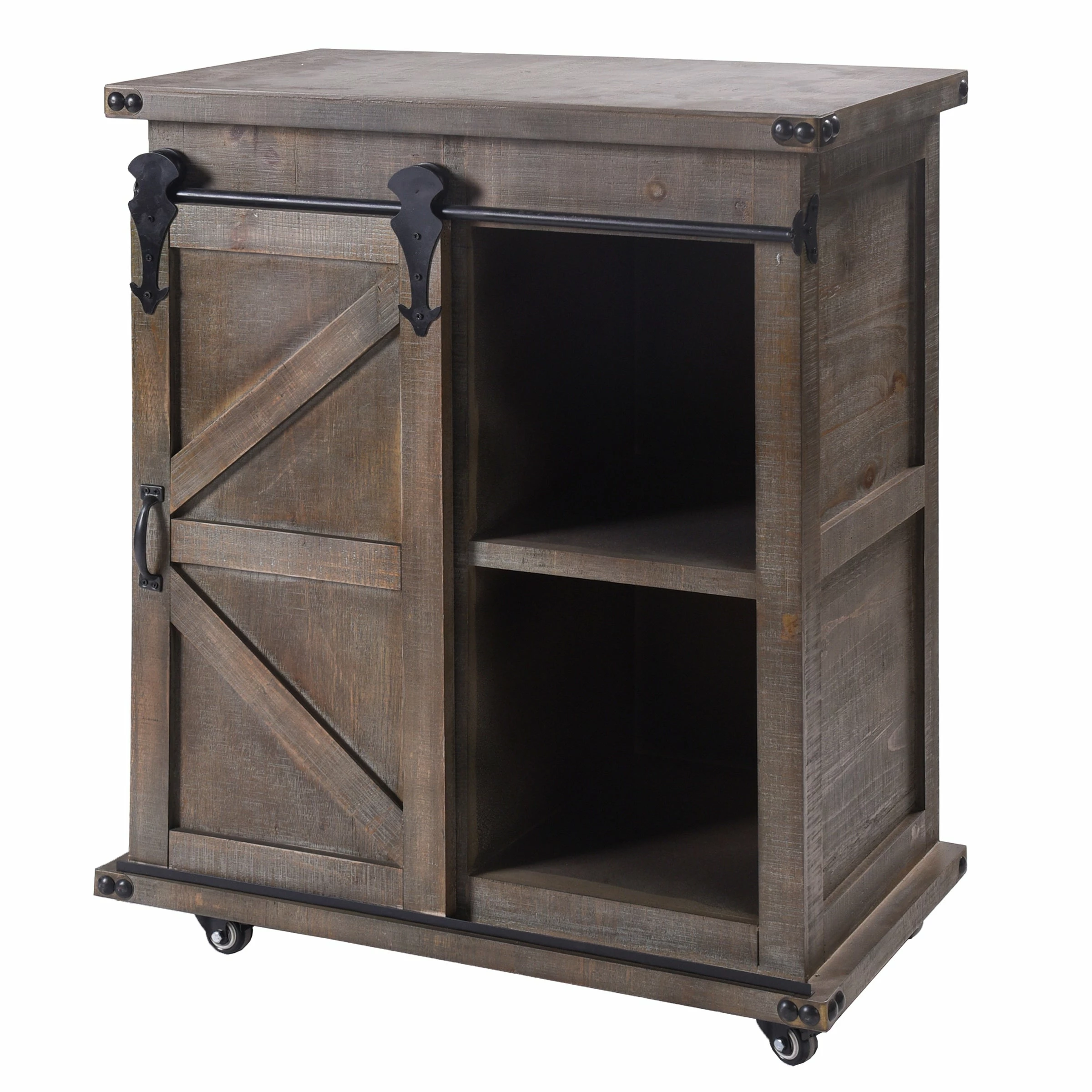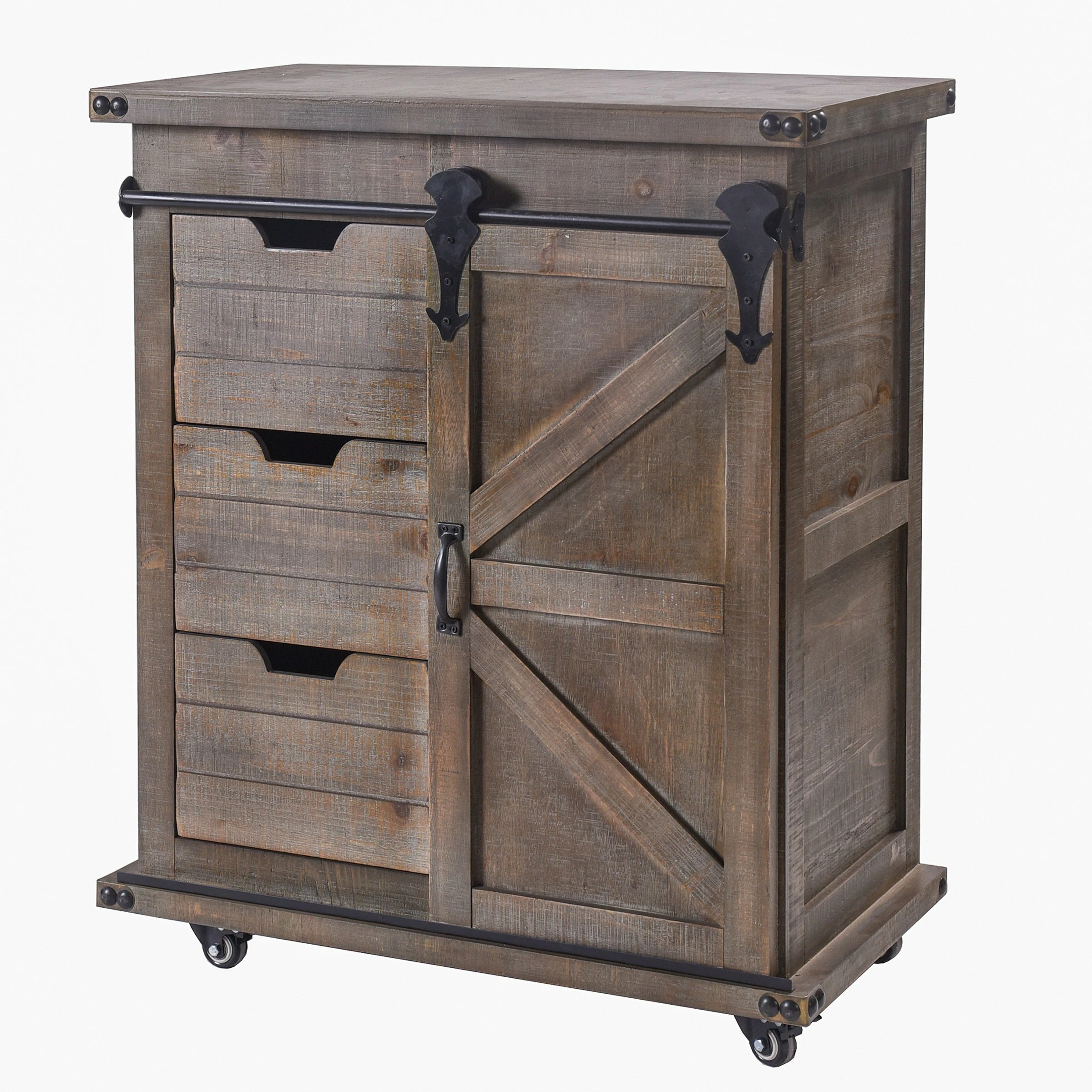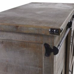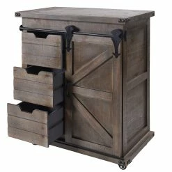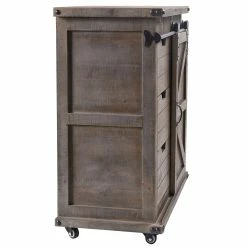 The Presley side cabinet is the perfect piece to add a rustic look to your space while providing a stylish storage area. The cabinet has a driftwood grey finish and black metal hardware and corner detailing. One side features a rolling barn-style door with raised wood accents while the other side has three drawers for keeping things organized and out of sight.