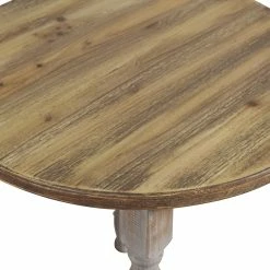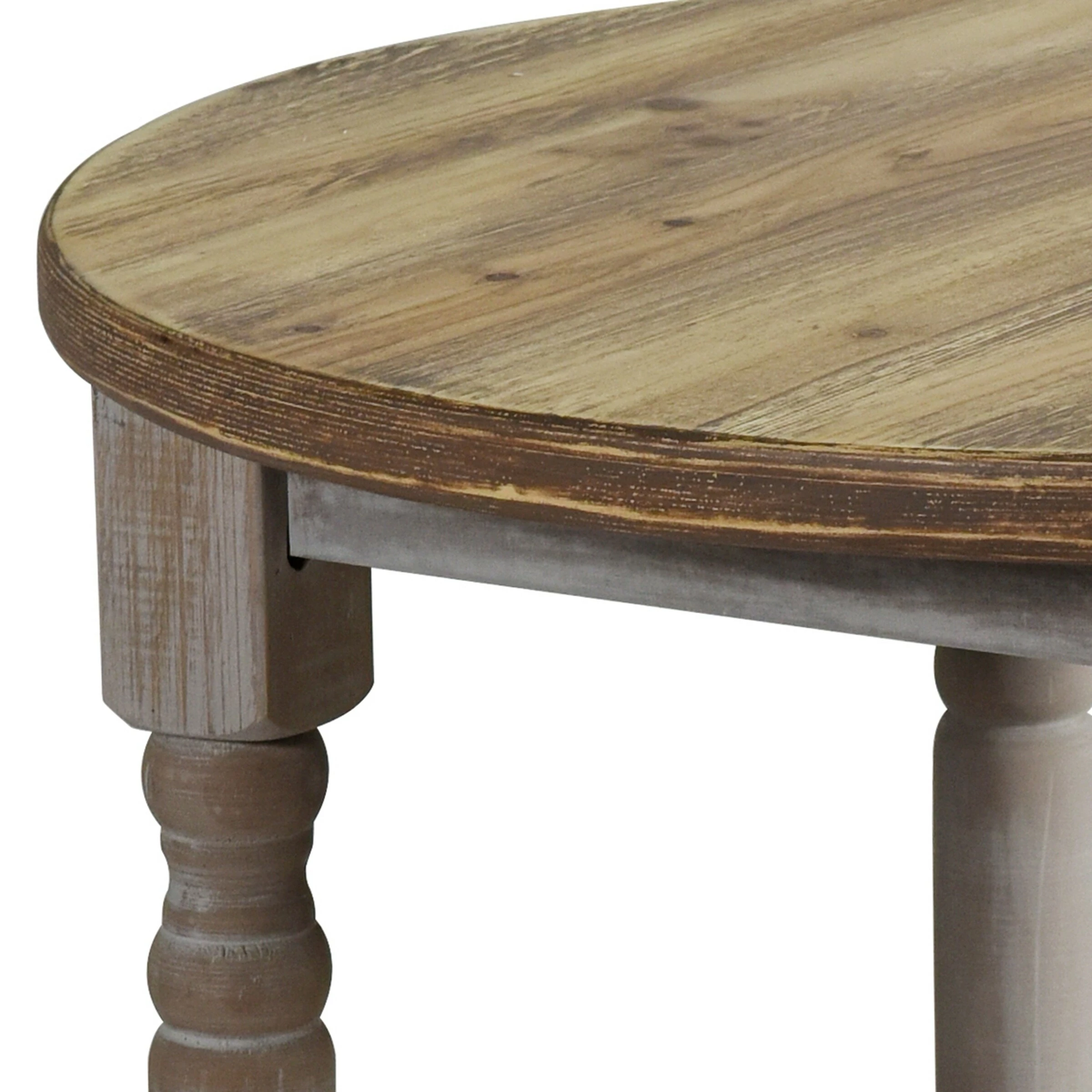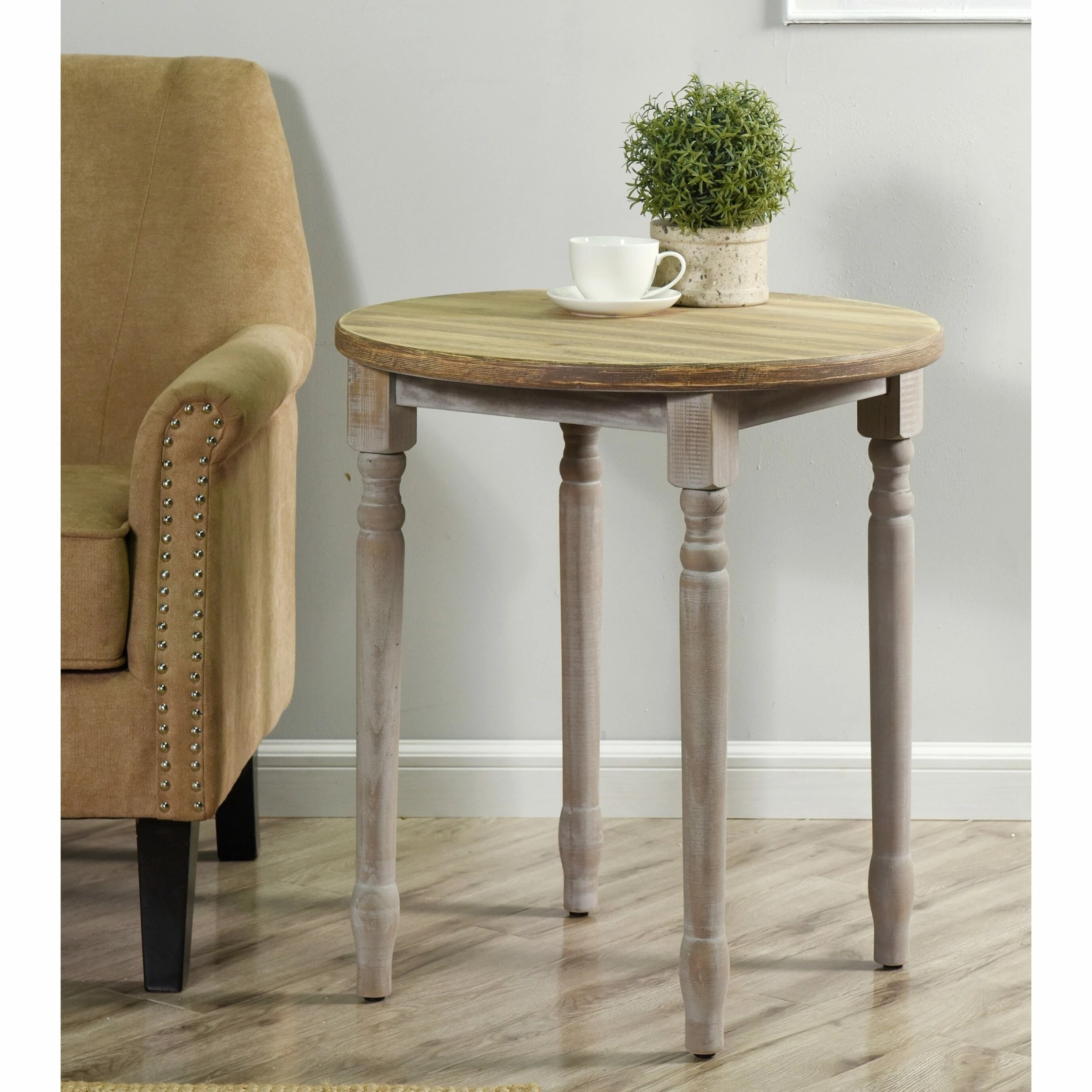This wooden spool-inspired side table contributes style and interest to your room. The round natural wood tabletop is reminiscent of an old wooden spool and has plenty of room for a romantic vignette of books, candles and flowers. The carved wooden legs are a bit more refined and delicate than a traditional wooden spool table. The legs are painted gray for an extra bit of personality.