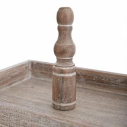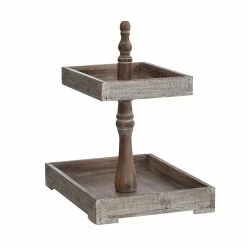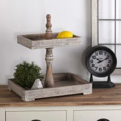 An exceptional piece of farmhouse-inspired dΓ©cor, this distressed wood tiered tray adds beauty and functionality to any dining room, kitchen, living room, or foyer. It features two rectangular trays stacked over one another and supported by a stylish central wooden column. This versatile piece can hold small accessories but is just as charming on its own.