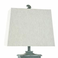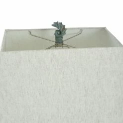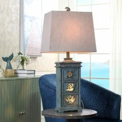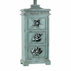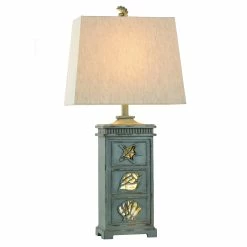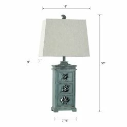 Showcasing coastal-inspired flair, the ceramic frame of this table lamp has cutout seashell designs and a distressed light blue finish. The matching blue finial atop the taupe fabric hardback shade is also in the shape of a seashell. Enhance nautical decor in a bedroom, office, hallway, dining room, or living room with this ocean-inspired lamp.