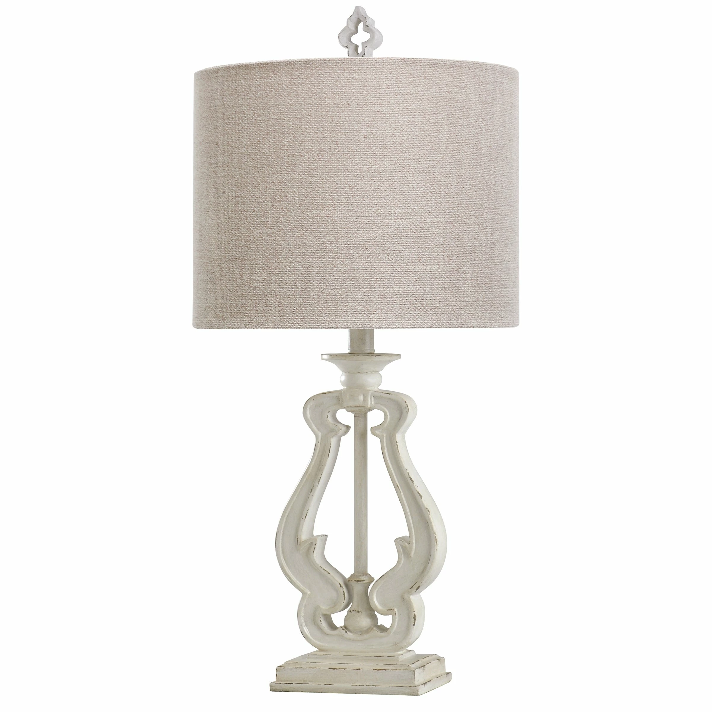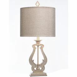 This table lamp comes in a distressed white frame with a textured beige and gray shade; Requires one (1) 60-watt Incandescent E26 base bulb (not included).
