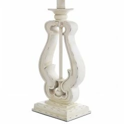 The most intriguing aspects of the Robert table lamp include the ornate structure and distressed white finish. The lamp itself is made from poly resin, so when you need to add some elegance to your study or master suite, this is the lamp to use. The white styrene shade and brush nickel accessories complete the old-fashioned aesthetic. A handpainted finish means each piece is unique, with possible slight variations. No two lamps are exactly alike.