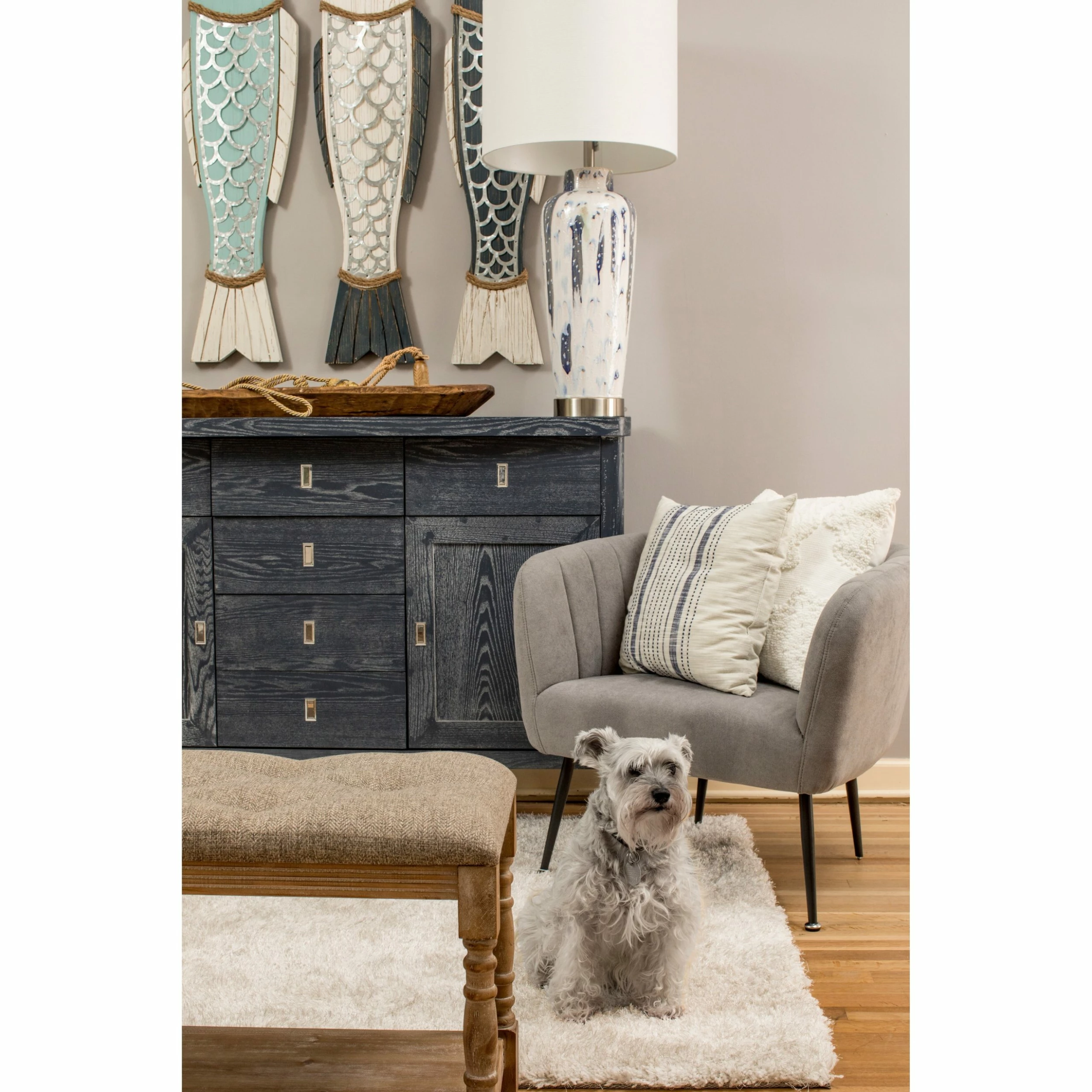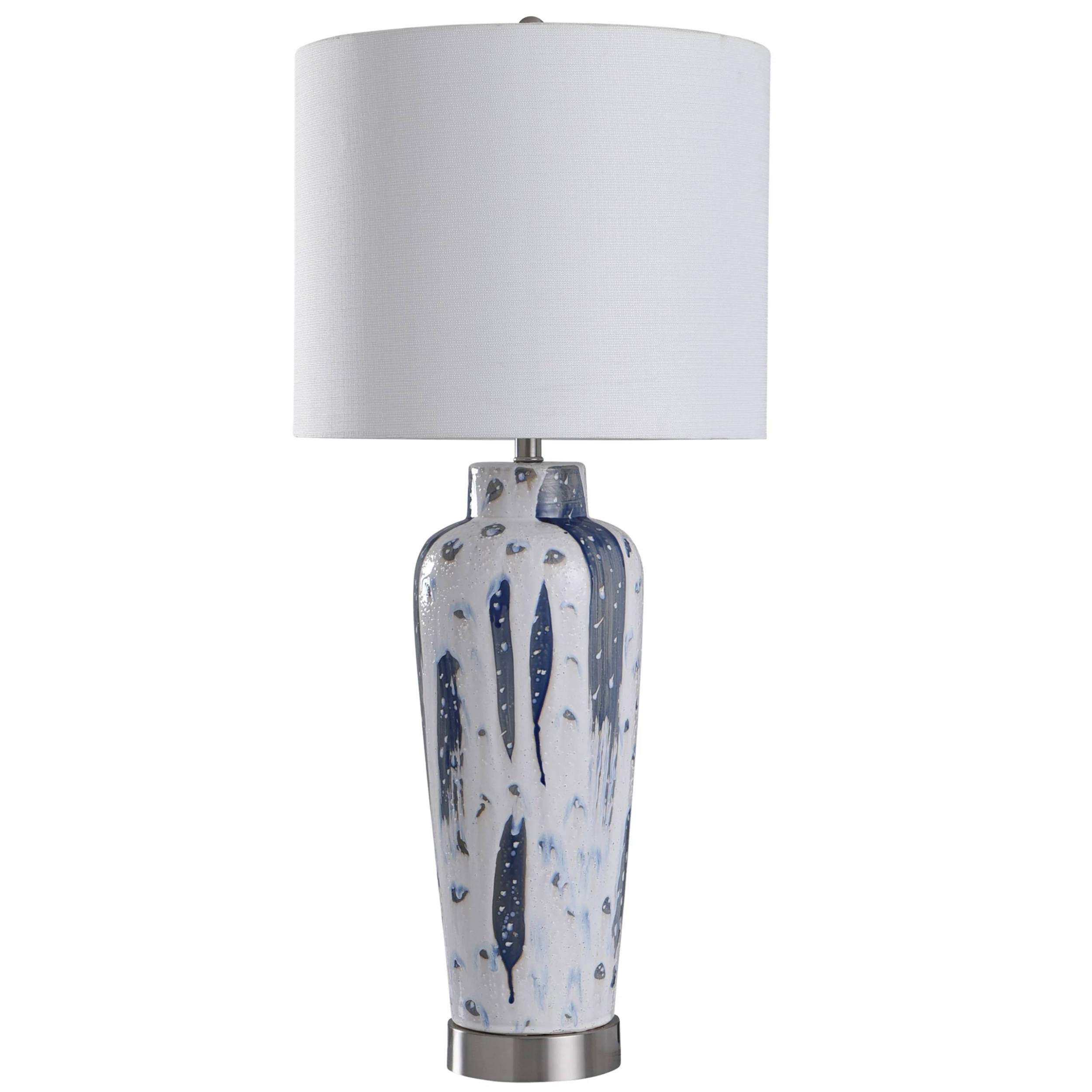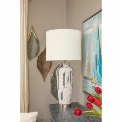 The Romani Blue table lamp features a gorgeous white ceramic body adorned with strokes of blue artfully painted throughout. The white drum shade lets the unique glazed body of this lamp shine. Place it as a focal point in the living room to update your ambiance with an artsy flair.