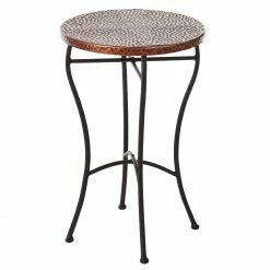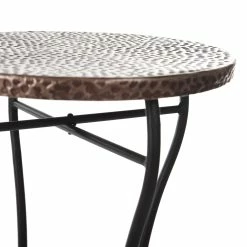 The Round Hammered Accent Table comes in a bronze powder coat wrought iron frame and a hammered copper top.