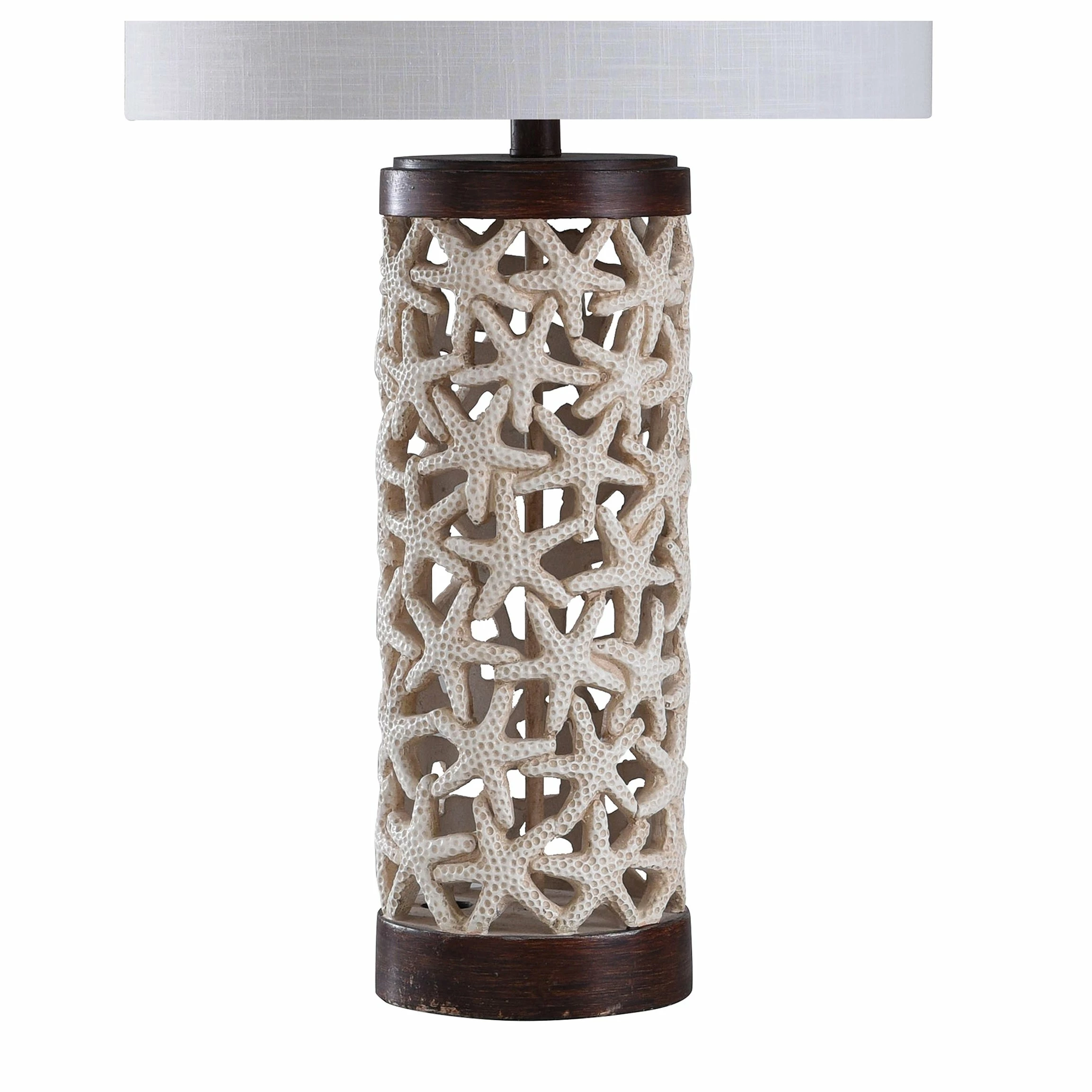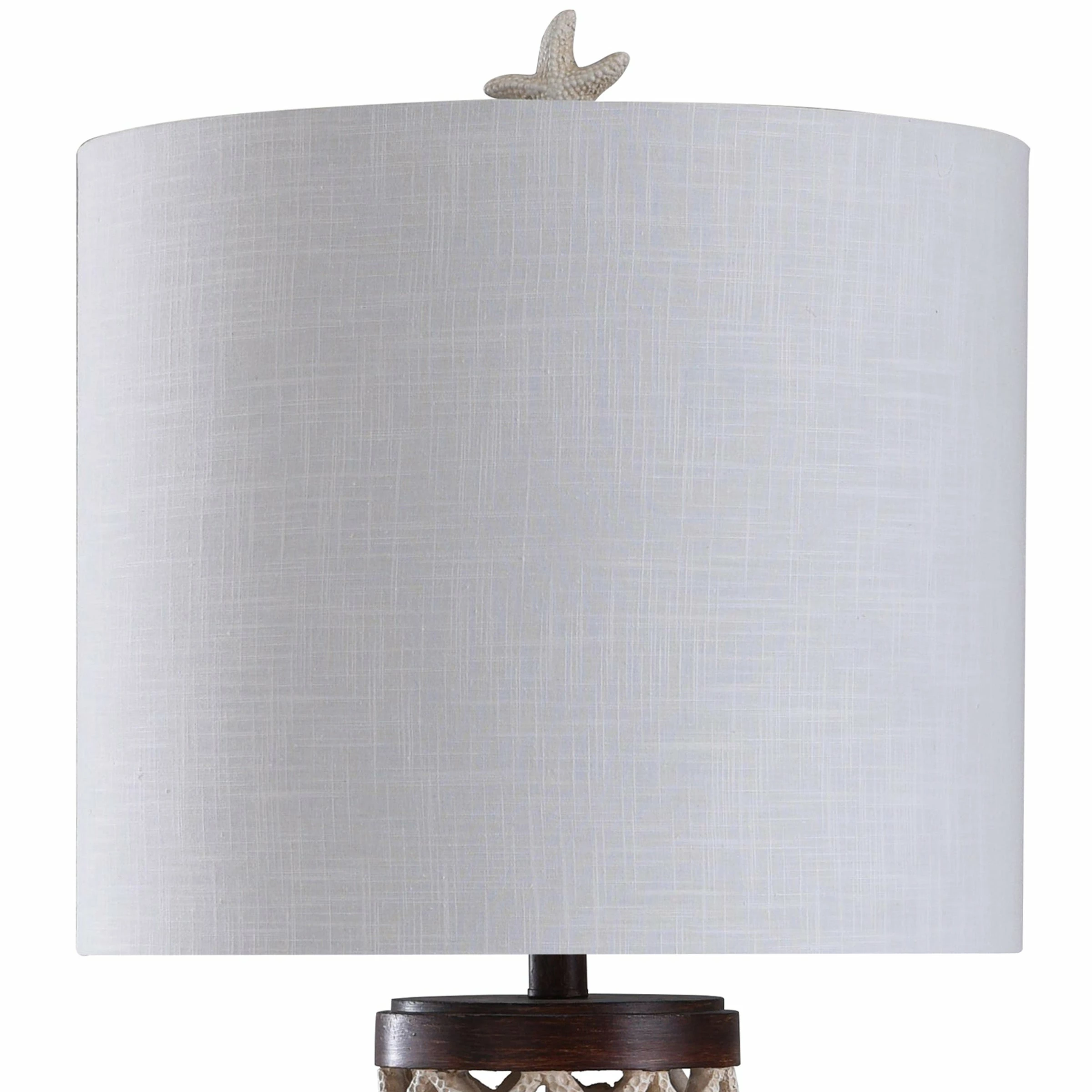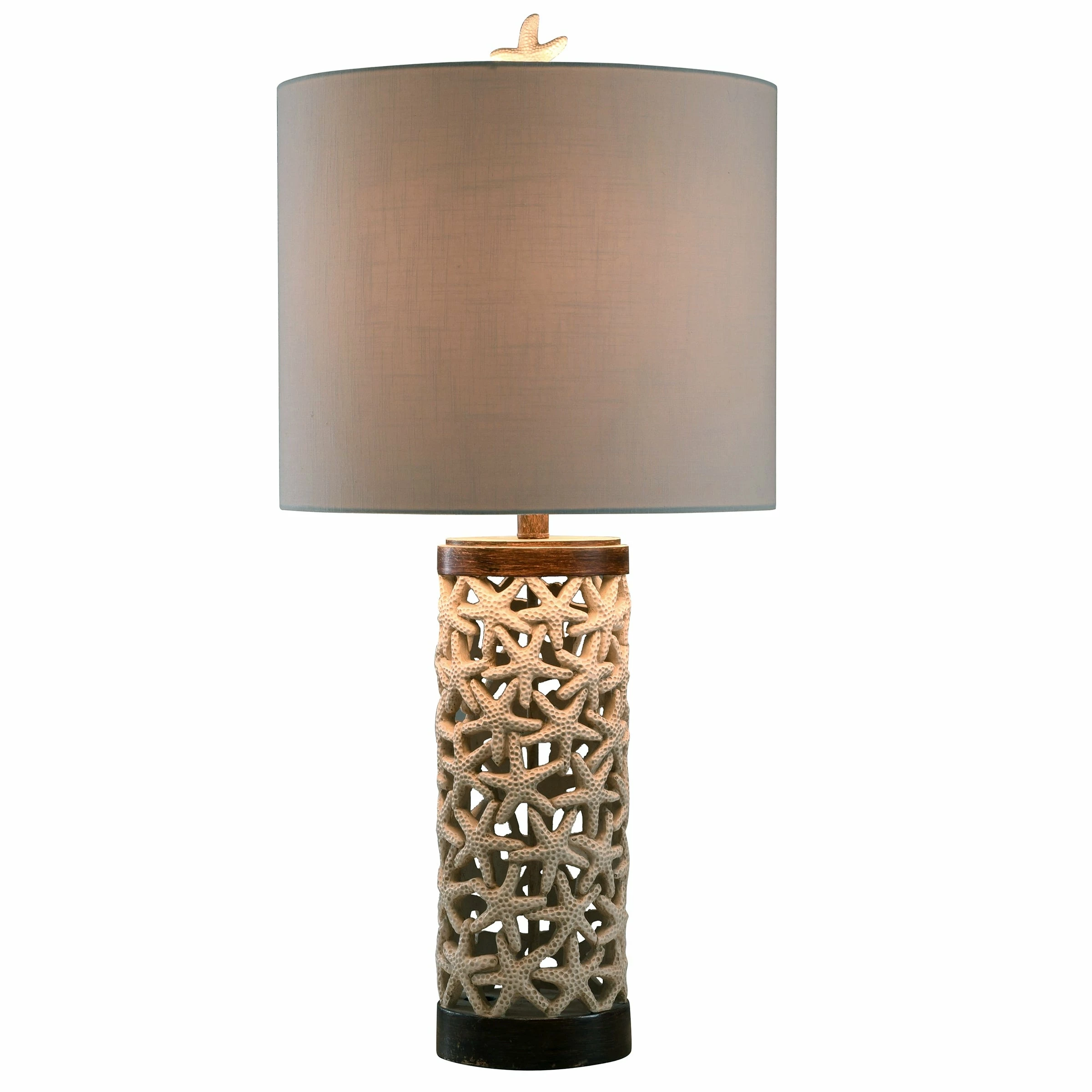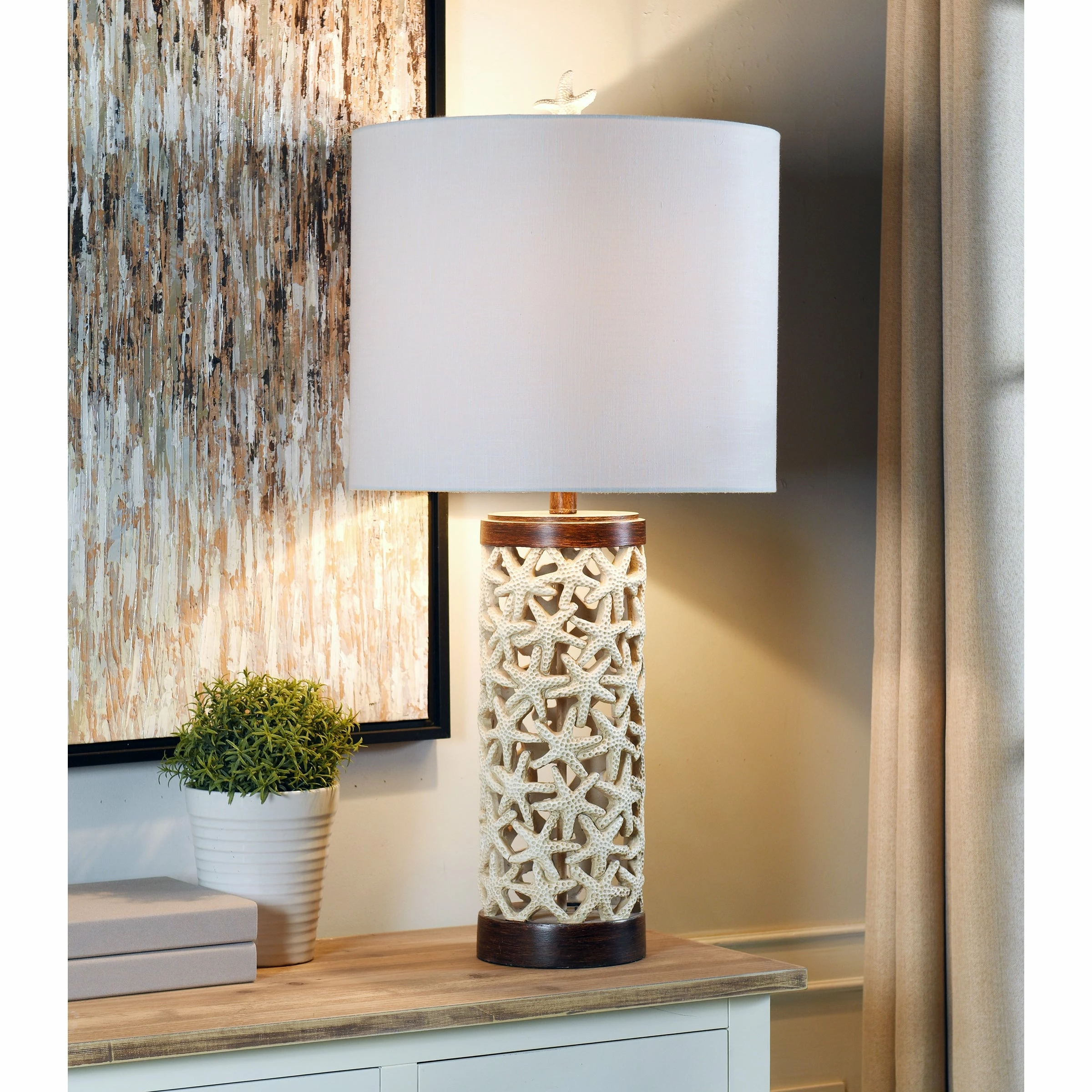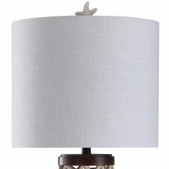 With its intricate base motif, this poly and acrylic table lamp uses a tall profile and rounded base to make a statement. It comes complete with a rolled edge hardback shade and nightlight cord for the perfect bedside look. This Table Lamp comes in a sand shell bronze polyresin and acrylic frame with a white styrene shade; Requires one (1) 100-watt Incandescent E26 base bulb (not included).
