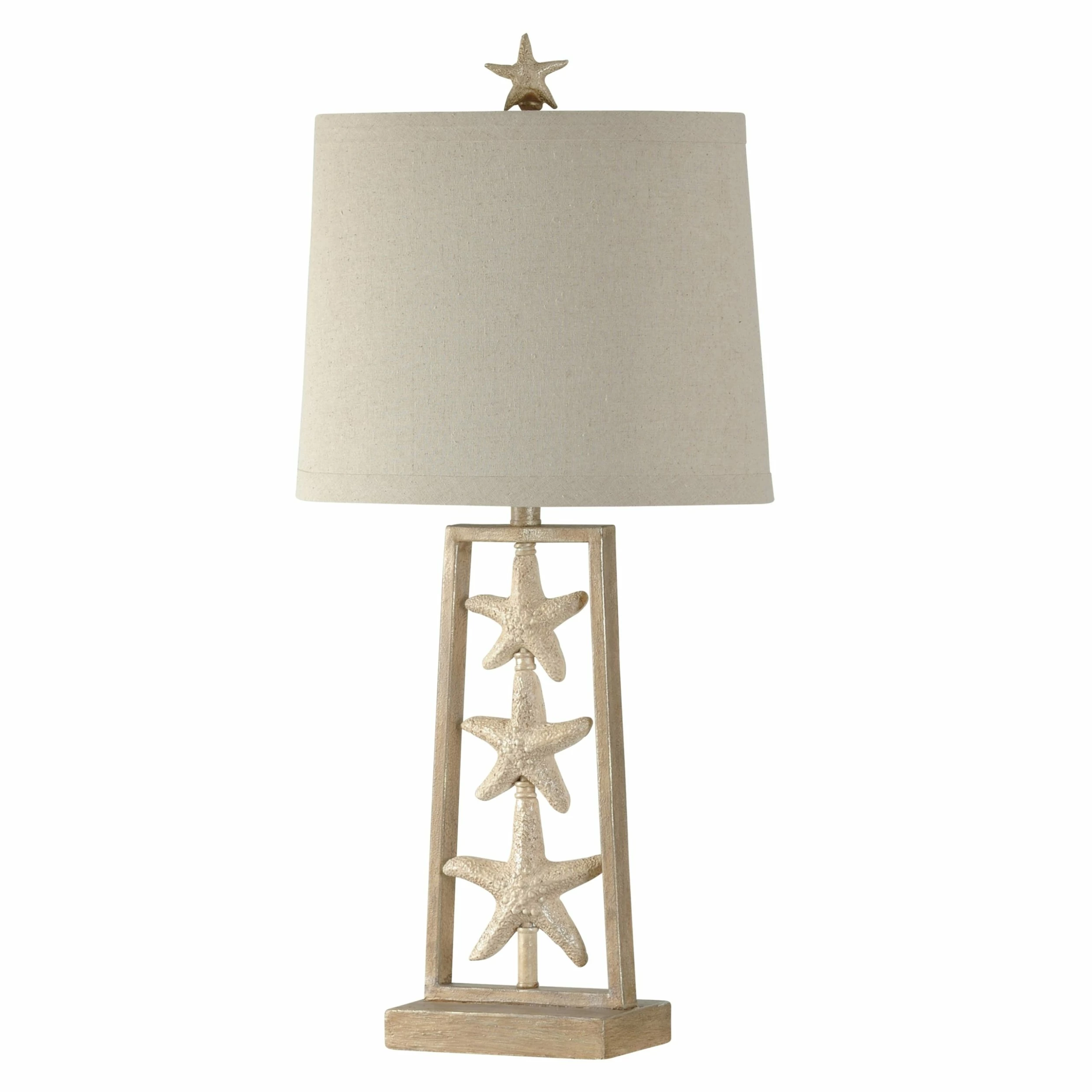 This coastal table lamp showcases a frame of three stacked starfish and a matching sea star finial. The lovely sandstone finish on the frame pairs beautifully with the white fabric of the hardback shade. Upgrade seaside-inspired decor in any home by displaying this beige lamp in a bedroom, living room, dining room, hallway, or office.