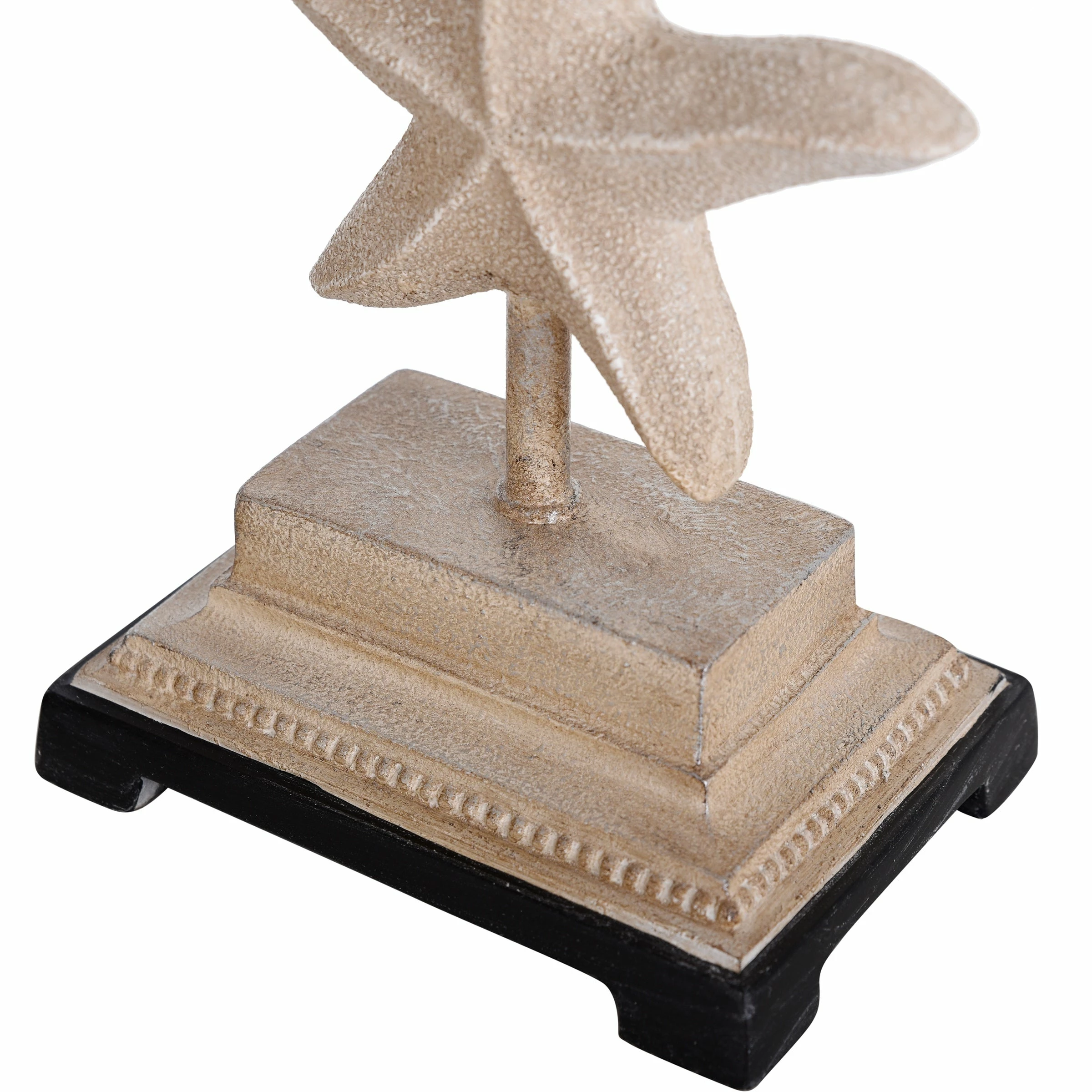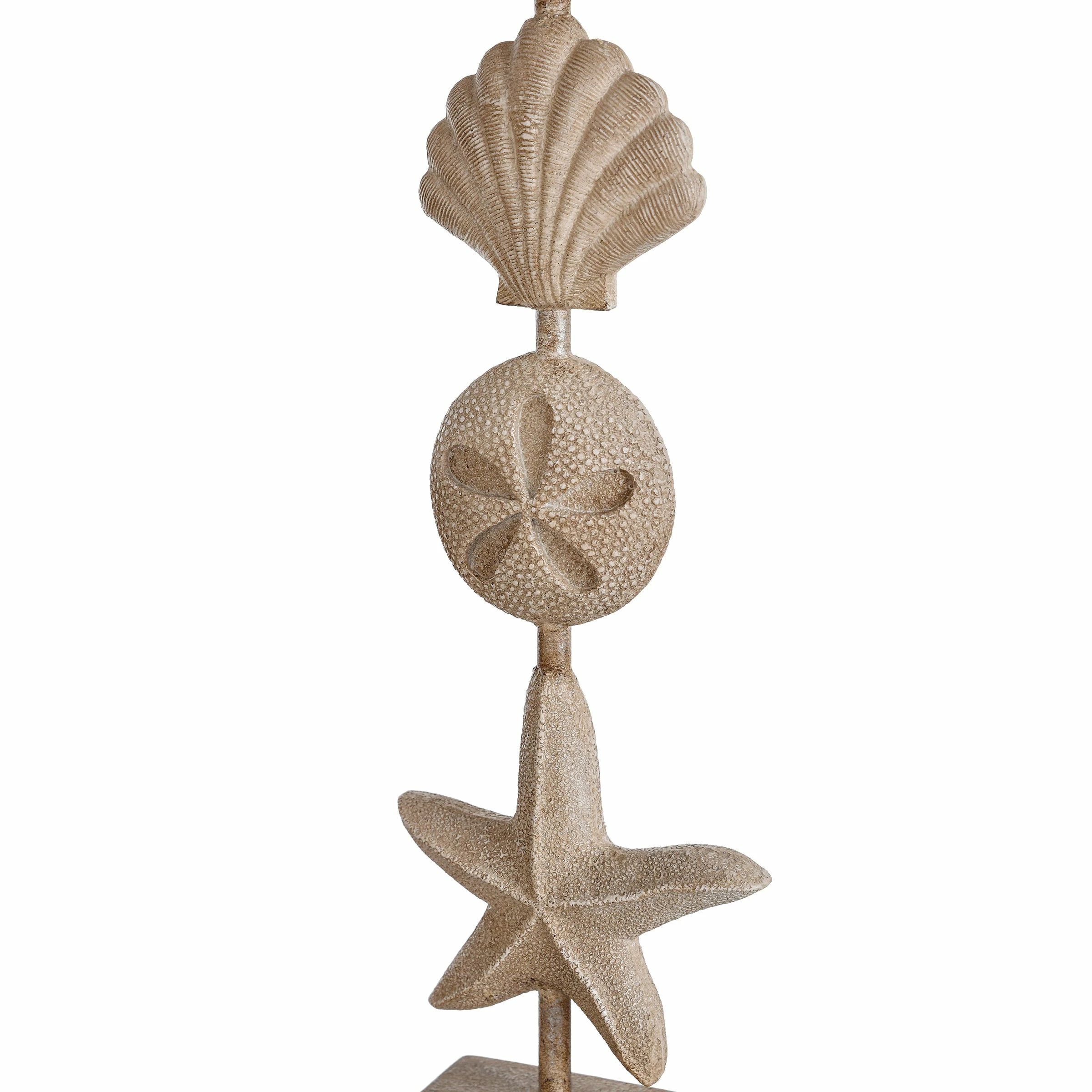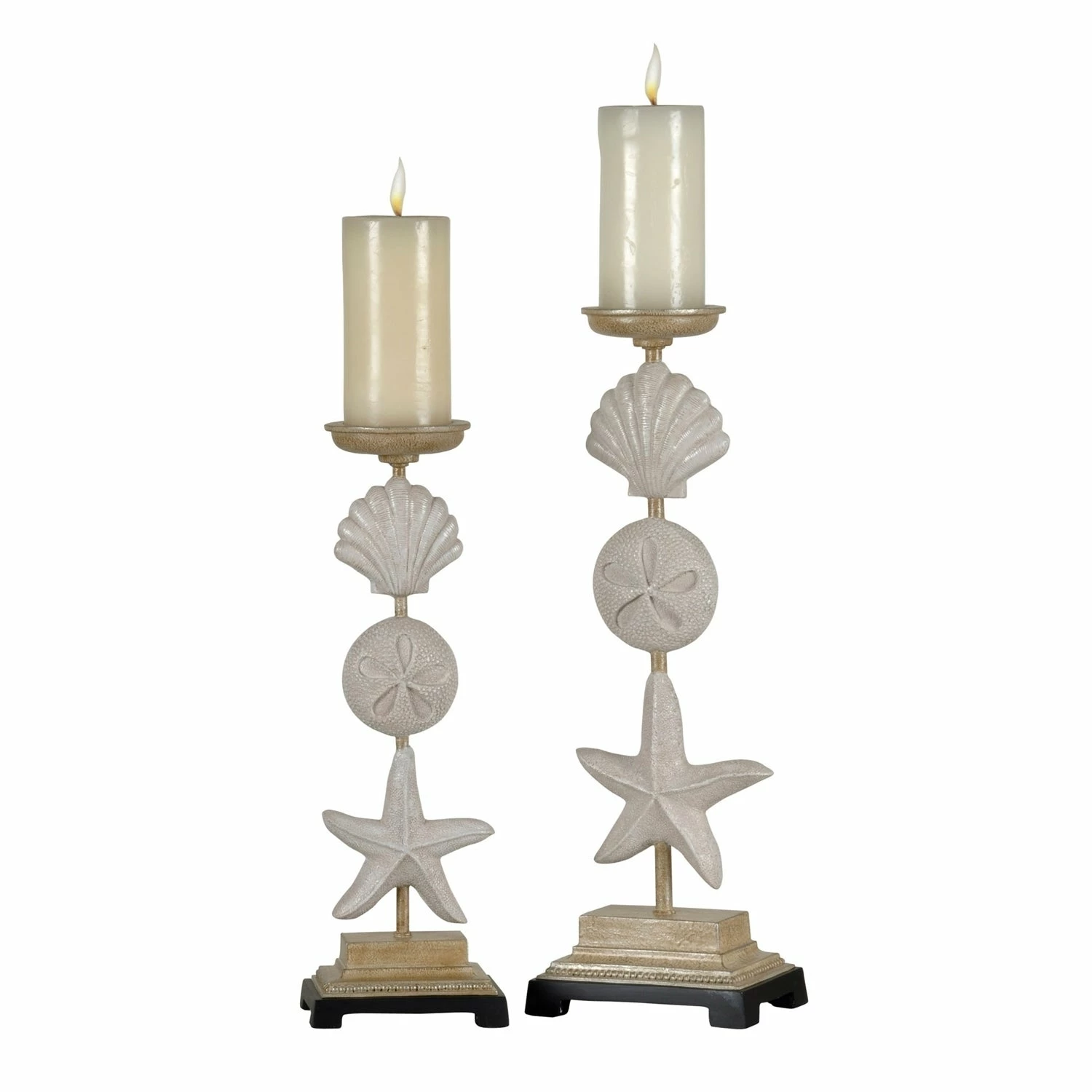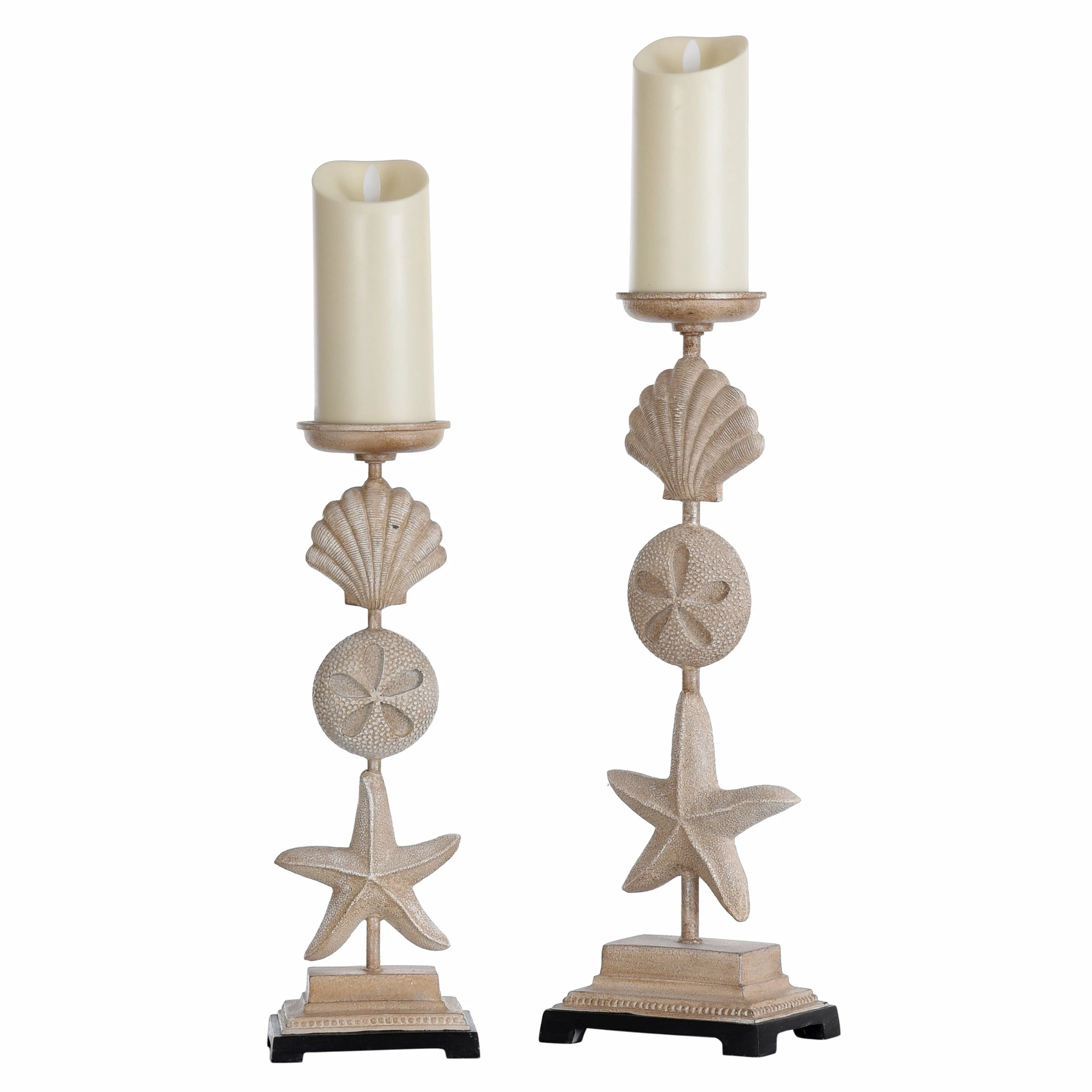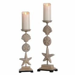 Perfect additions to any room with coastal-inspired décor, both candleholders in this set of two have a dark base and a beige finish. The design of each piece includes a starfish, sand dollar, and seashell. Whether displayed together or separately, these candleholders add ocean-inspired flair to a side table in a hallway, dining room, office, bedroom, or living room.
