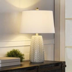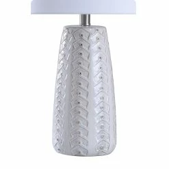 You can perk up your living room with the eclectic design of the Shannon table lamp. It is made from ceramic that is off-white and comes with a slight discoloration. This complex coloring is complemented wonderfully with the round, hardback shade that features a white liner. A handpainted finish means each piece is unique, with possible slight variations. No two lamps are exactly alike.