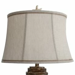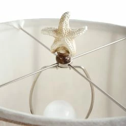 A beach-themed table lamp with a brown and beige finish, this fixture is an ideal accent to coastal dΓ©cor. The beige frame is an openwork design of numerous small starfish, and the base and top feature a distressed brown finish. The softback fabric shade is beige, and there is a sea-star finial at the top, making this ocean-inspired lamp an eye-catching fixture for a hallway, dining room, office, bedroom, or living room.
