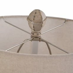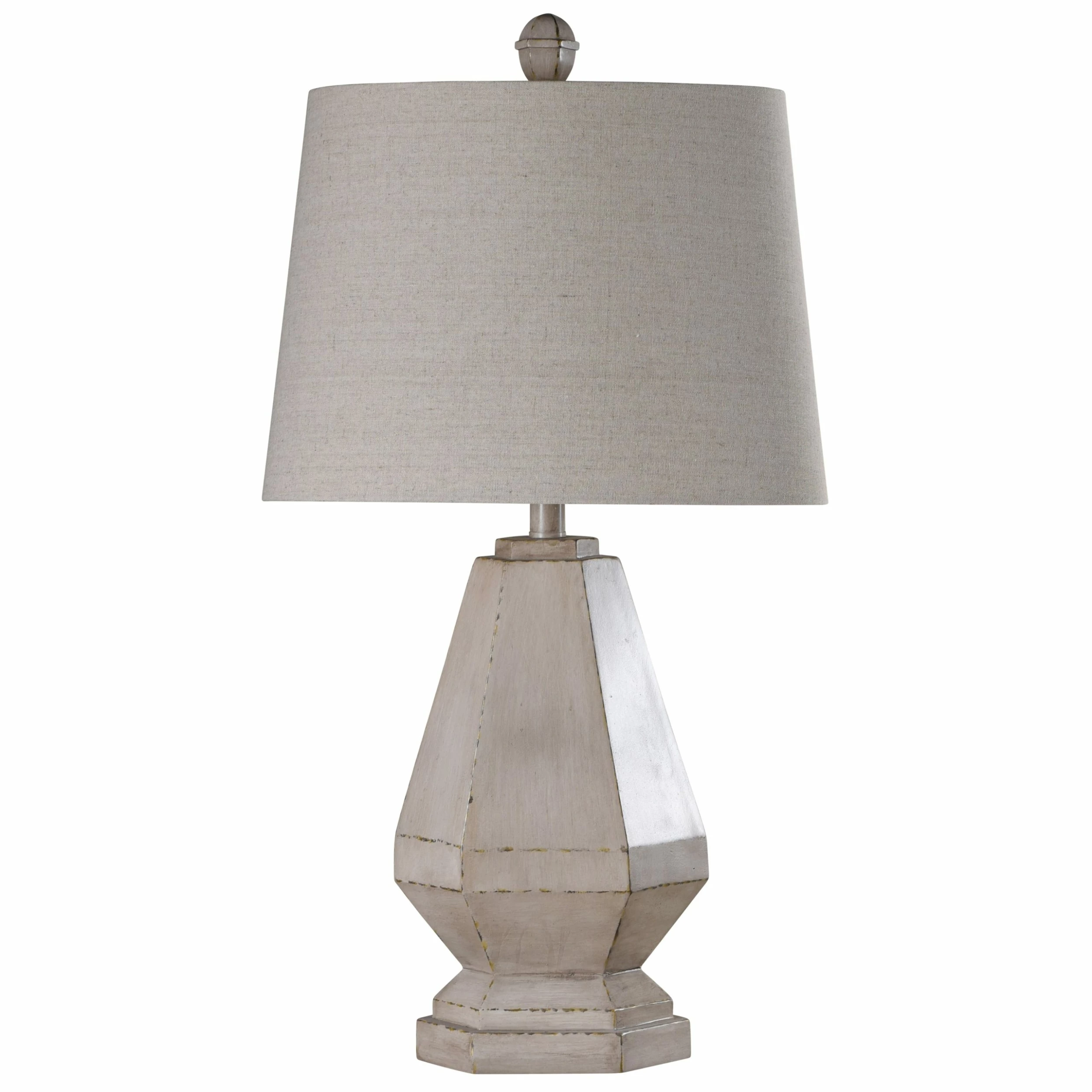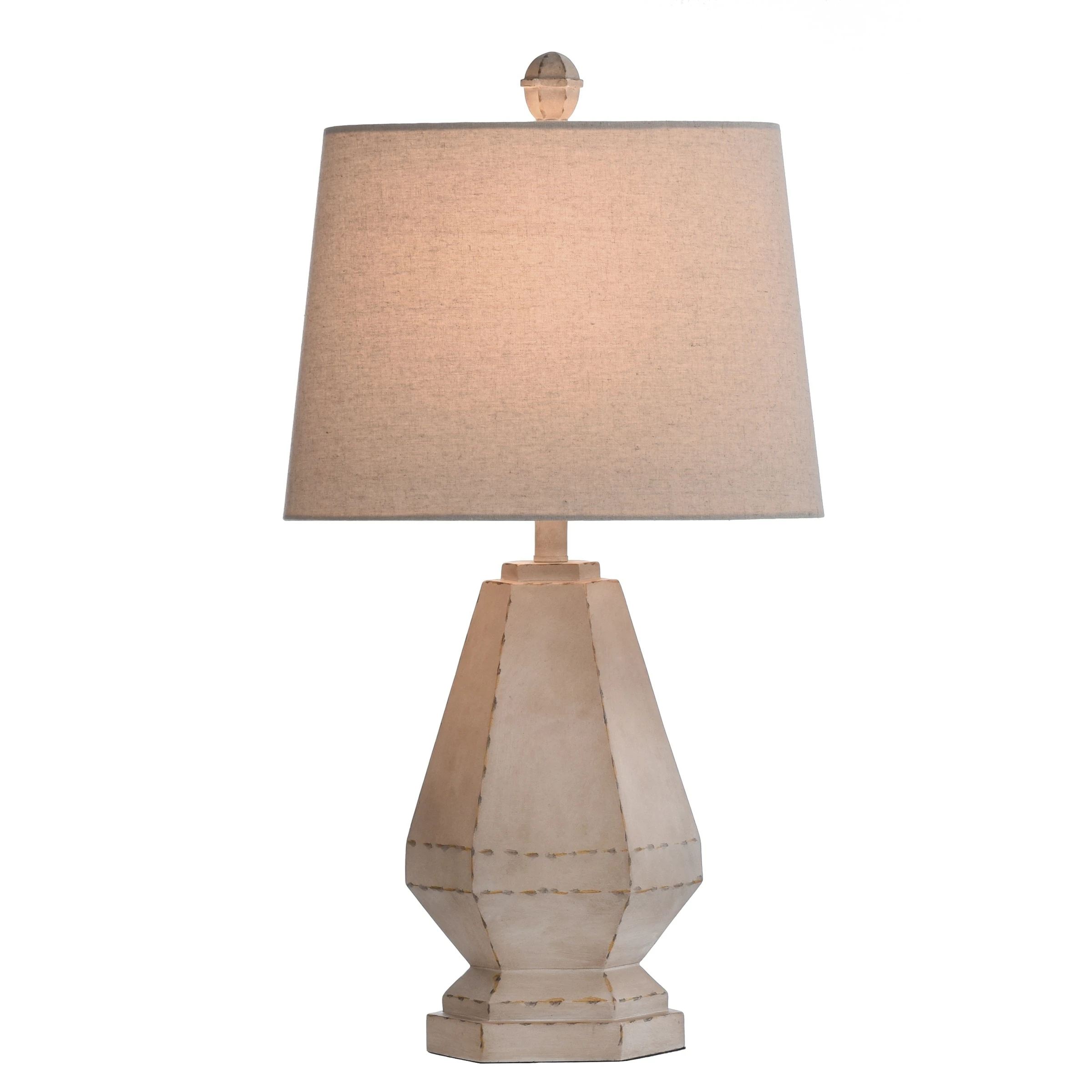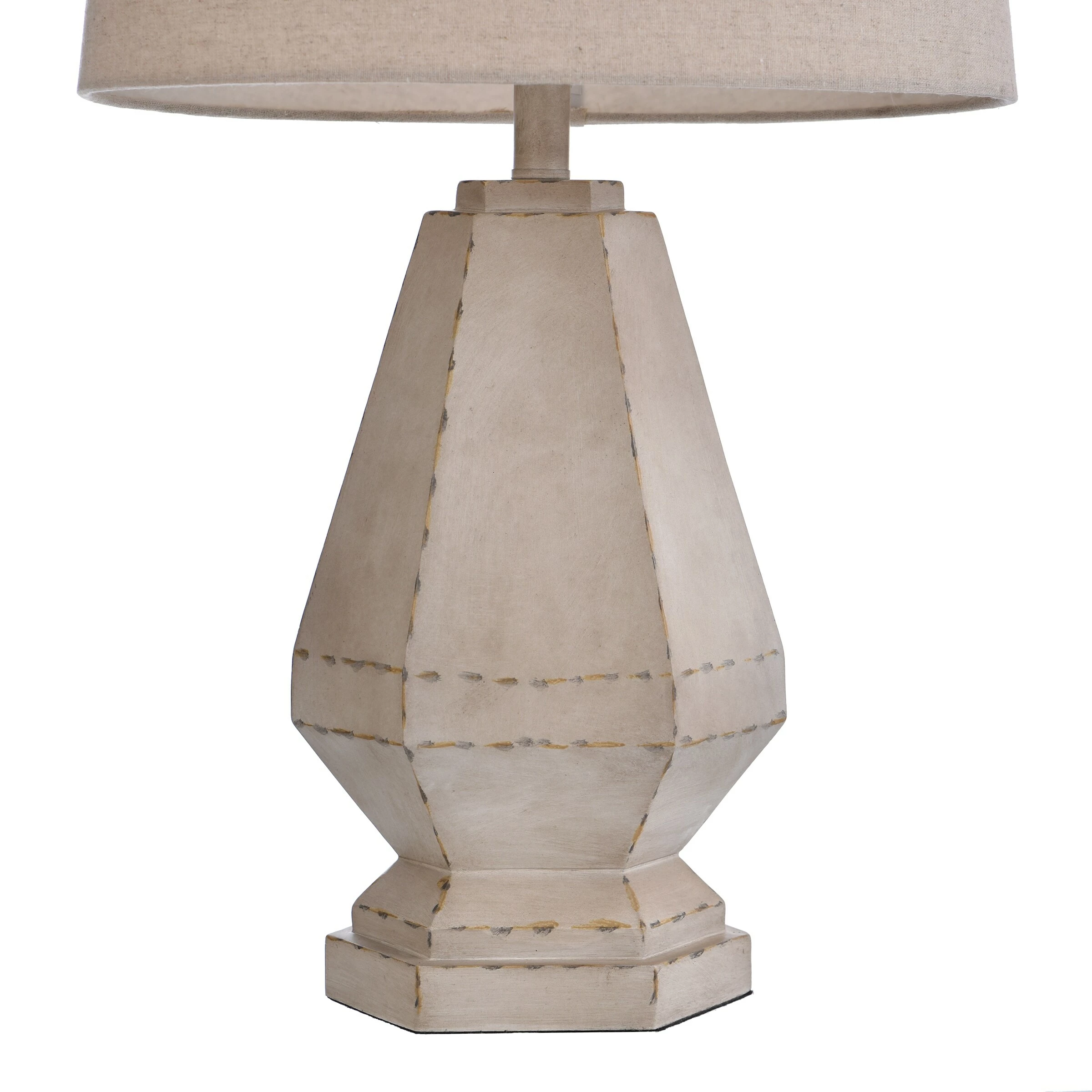 This poly table lamp incorporates a geometric form made from poly with a oval hardback shade for a modern look. Its broad form and large profile make it a great centerpiece touch. This Table Lamp comes in a cream polyresin frame with an off white styrene shade; Requires one (1) 100-watt Incandescent E26 base bulb (not included).