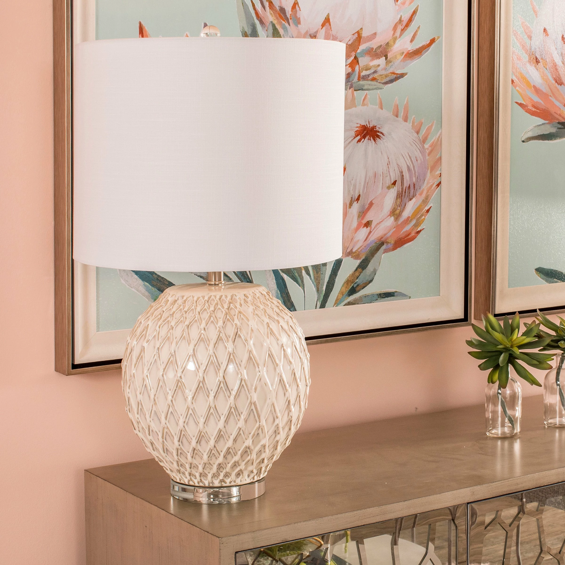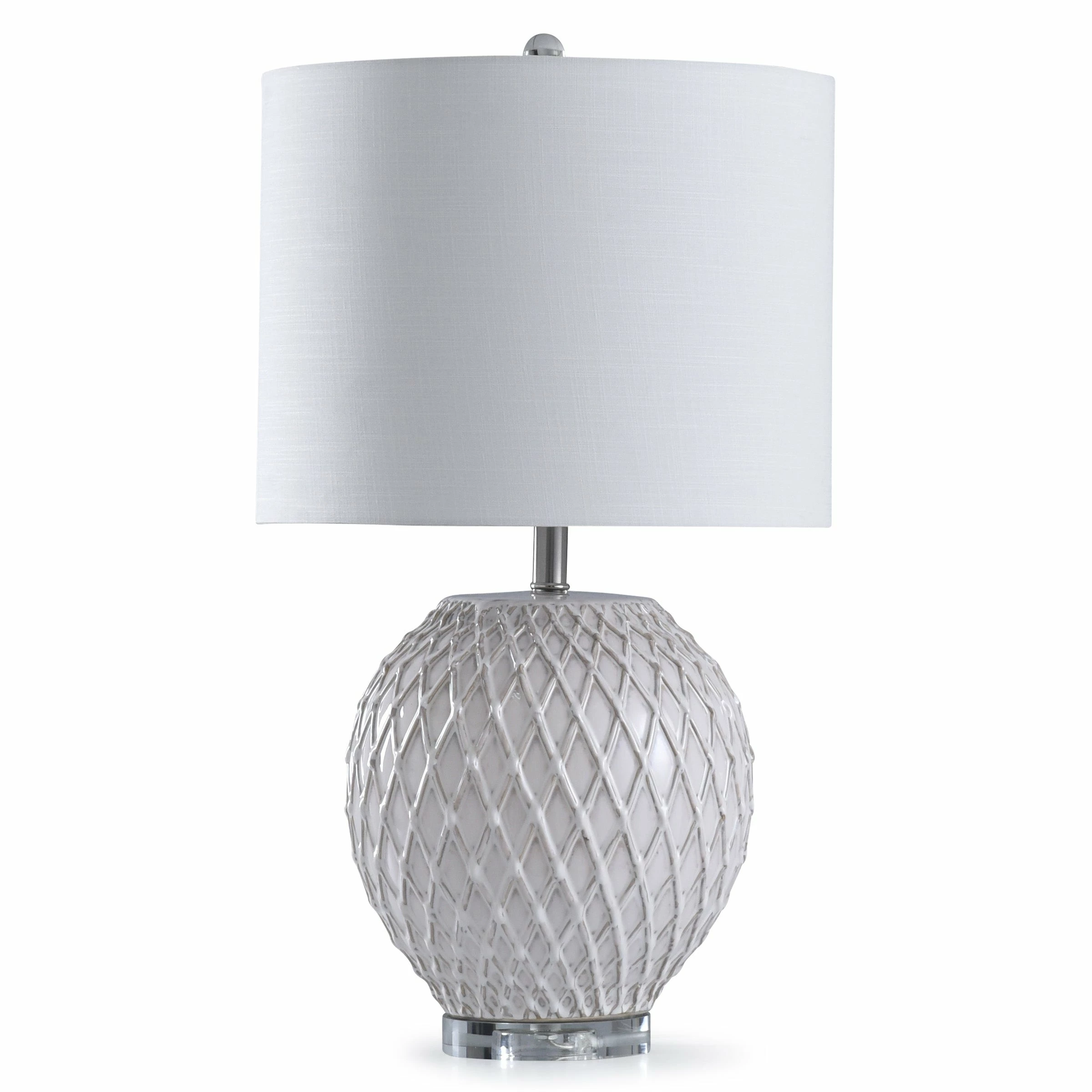 A table lamp that derives modern style from its classic form. The ceramic body presents a white and grey quilted aesthetic, adding dynamic texturing to the round body. The white shade is made of rayon and polyester and offers a nice complement to the ceramic. An elegant modern transitional piece, this table lamp looks best in dining rooms, living rooms, foyers and bedrooms.