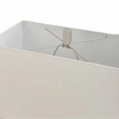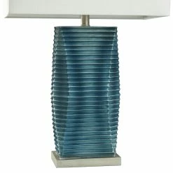The Thame table lamp is a contemporary fixture with bold features, including a steel base, a blue molded frame, and a white rectangular shade. The intriguing shape of the blue frame is enhanced by its textured horizontal lines. With its silver finial and three-way functionality, this blue and white lamp works well on a side table in a living room or family room.