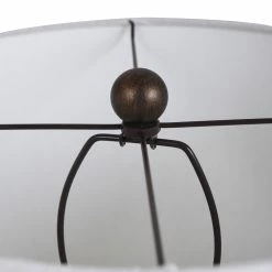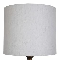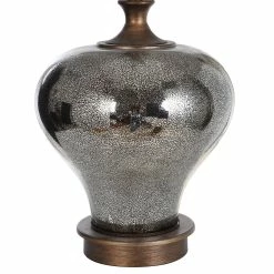 Featuring an off white heathered shade atop a vase-like frame of chrome mercury glass on a brushed copper base, the Thetford table lamp is a stunning contemporary accent. An eye-catching fixture for a living room or family room, this mercury glass lamp features a brushed copper finial that matches the base. The simple drum shape enhances the sleek curves of the lustrous frame.