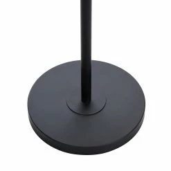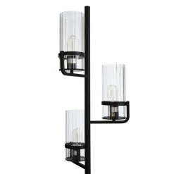 With three lights and a satin black frame, this industrial-inspired floor lamp can brighten up any living room, hallway, or dining room. It can also provide stylish illumination in a bedroom or office. There are three arms at various heights on the frame, and each one supports an Edison bulb inside a shade of clear ribbed glass.