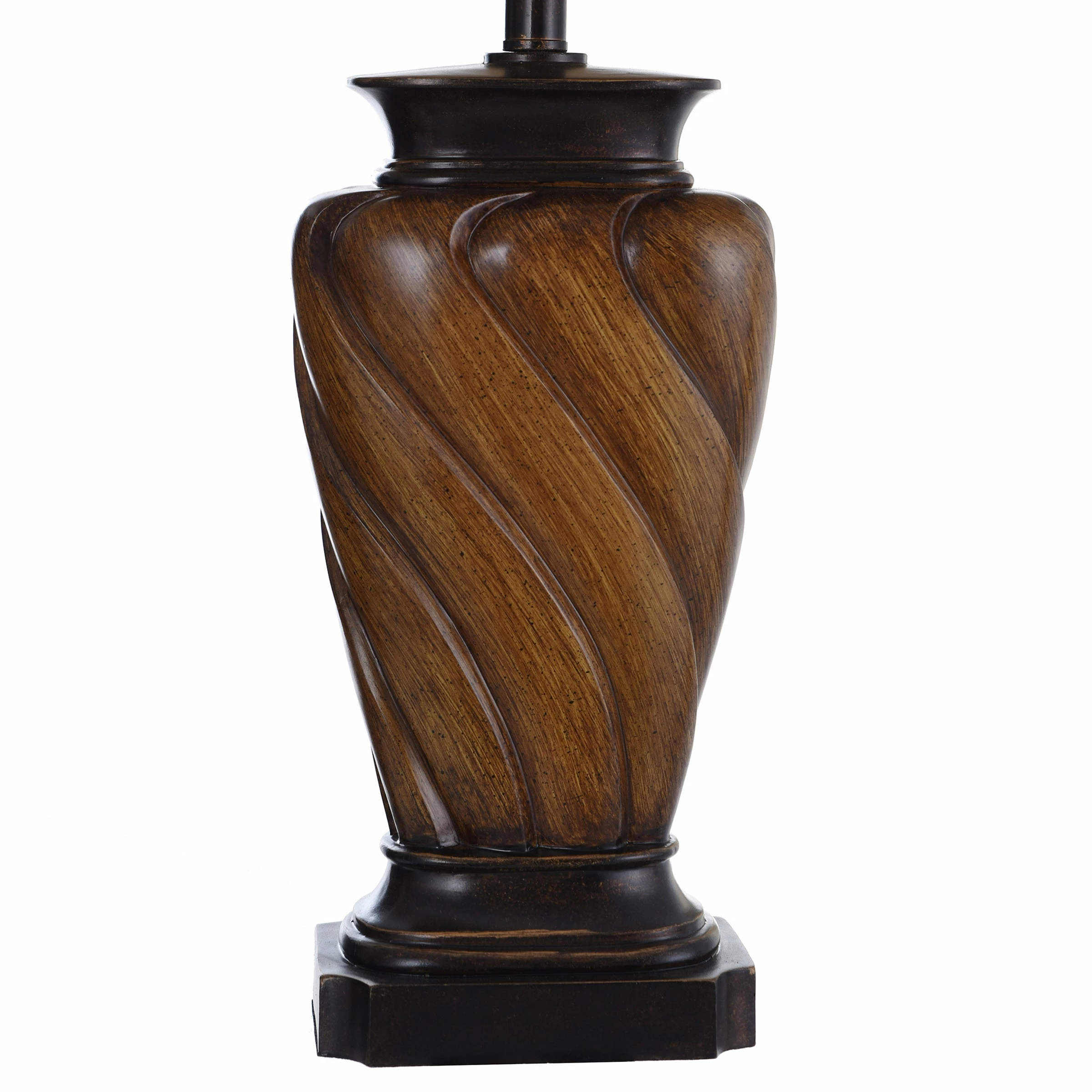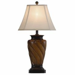 Showcasing an elegant design and rich, detailed finishes, this brown and white table lamp enhances the dΓ©cor in a bedroom, office, or hallway. Displayed on a living room or dining room table, this lamp radiates soft light from the incandescent bulb housed inside the white fabric shade. The swirled frame features a gleaming toffee wood finish that matches the brown accents on the shade.