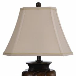 This Table Lamp comes in a toffee wood poly frame with a white fabric shade; Requires one (1) 75-watt Incandescent E26 base bulb (not included).
