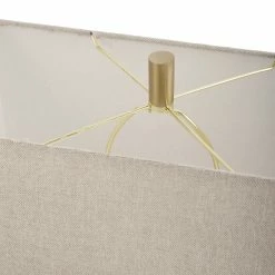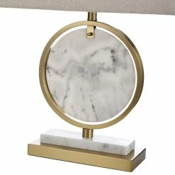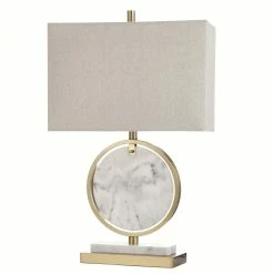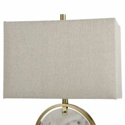 A stunning modern fixture with a traditional foundation, the Ulster table lamp features an off white rectangular shade atop a steel base with a brass finish and a circular white marble insert. The oatmeal color of the shade complements the two-level base made of both steel and marble. With its brass finial and three-way switch, this steel and marble table lamp is ideal for a living room or family room.