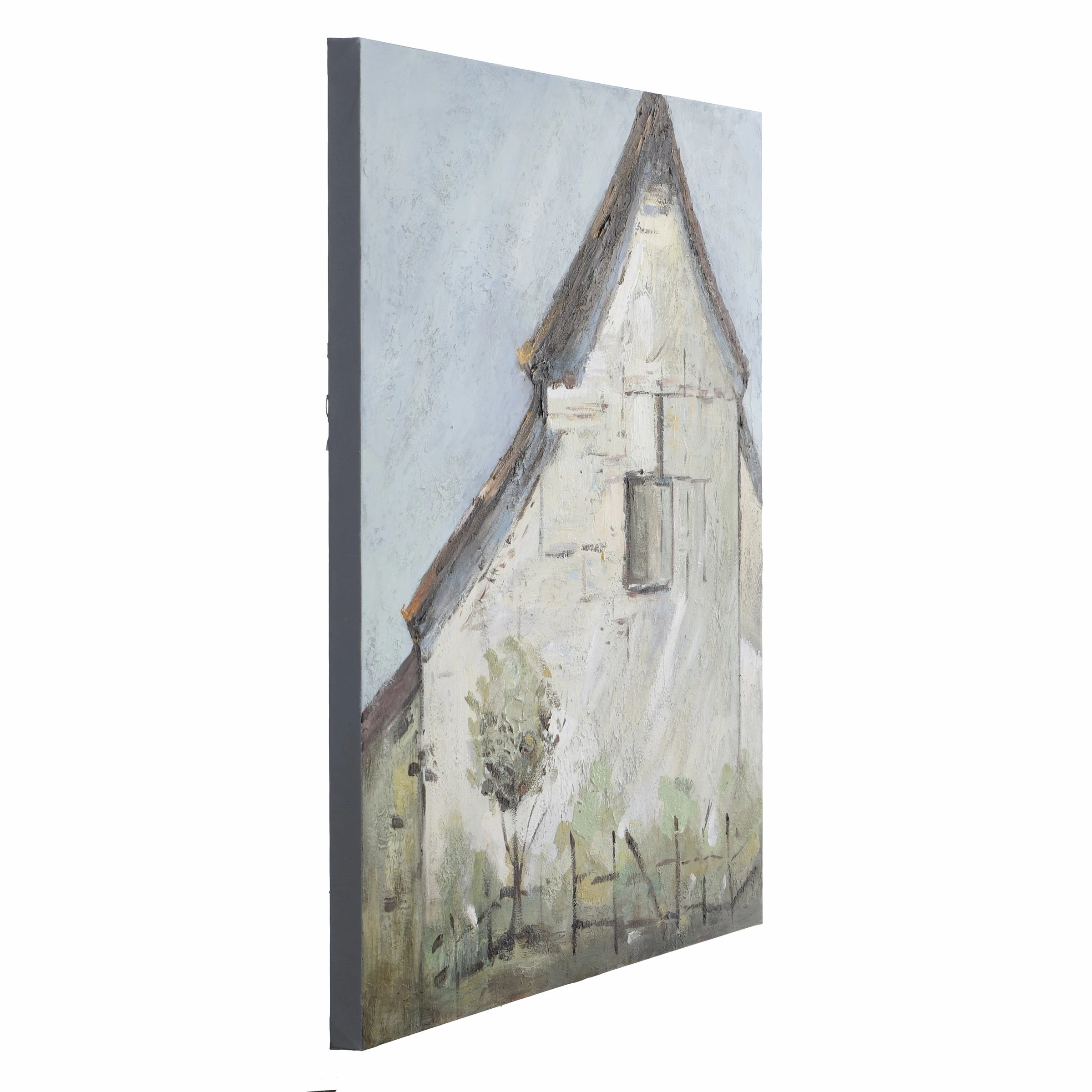 This hand painted wall art displays a vintage farm house and is made out of canvas, wood, paint material.