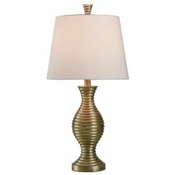 Add some flair to any accent table with the Vintage Gold table lamp. The gold finish rests upon the poly resin body, and the results are absolutely stunning. Topped off with a round, hardback shade, this is one lamp that will get your friends and family members talking. A handpainted finish means each piece is unique, with possible slight variations. No two lamps are exactly alike.