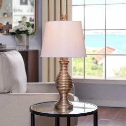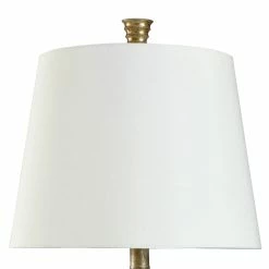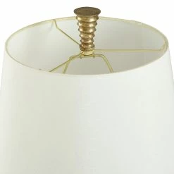 This table lamp comes in a vintage gold frame with a whisper white shade; Requires one (1) 60-watt Incandescent E26 base bulb (not included).