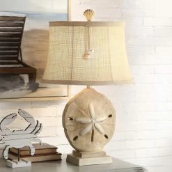 The Large Sand Dollar Lamp with Vipiteno Finish brings to mind memories of collecting sand dollars and other treasures on the beach. The sandstone and silver finish of the poly body brings a certain elegance to the lamp. The white softback fabric shade with a shell tassel rounds out the nautical aesthetic in glorious fashion. Add this bold piece to your living room.