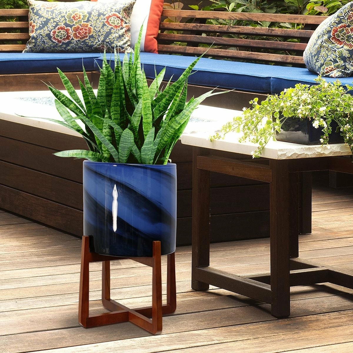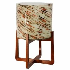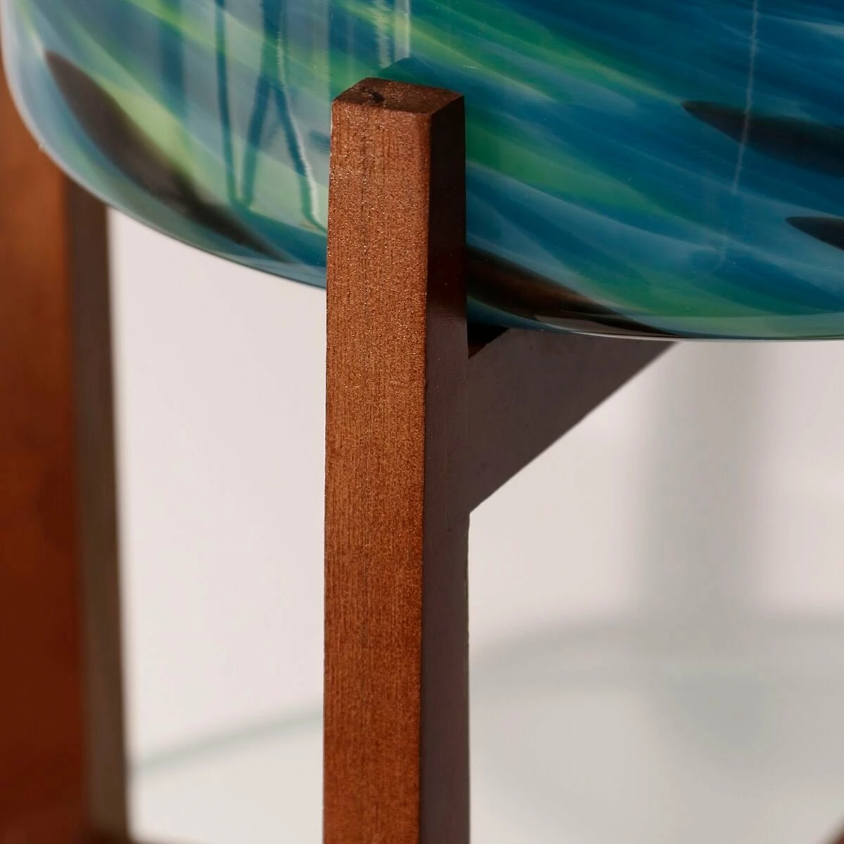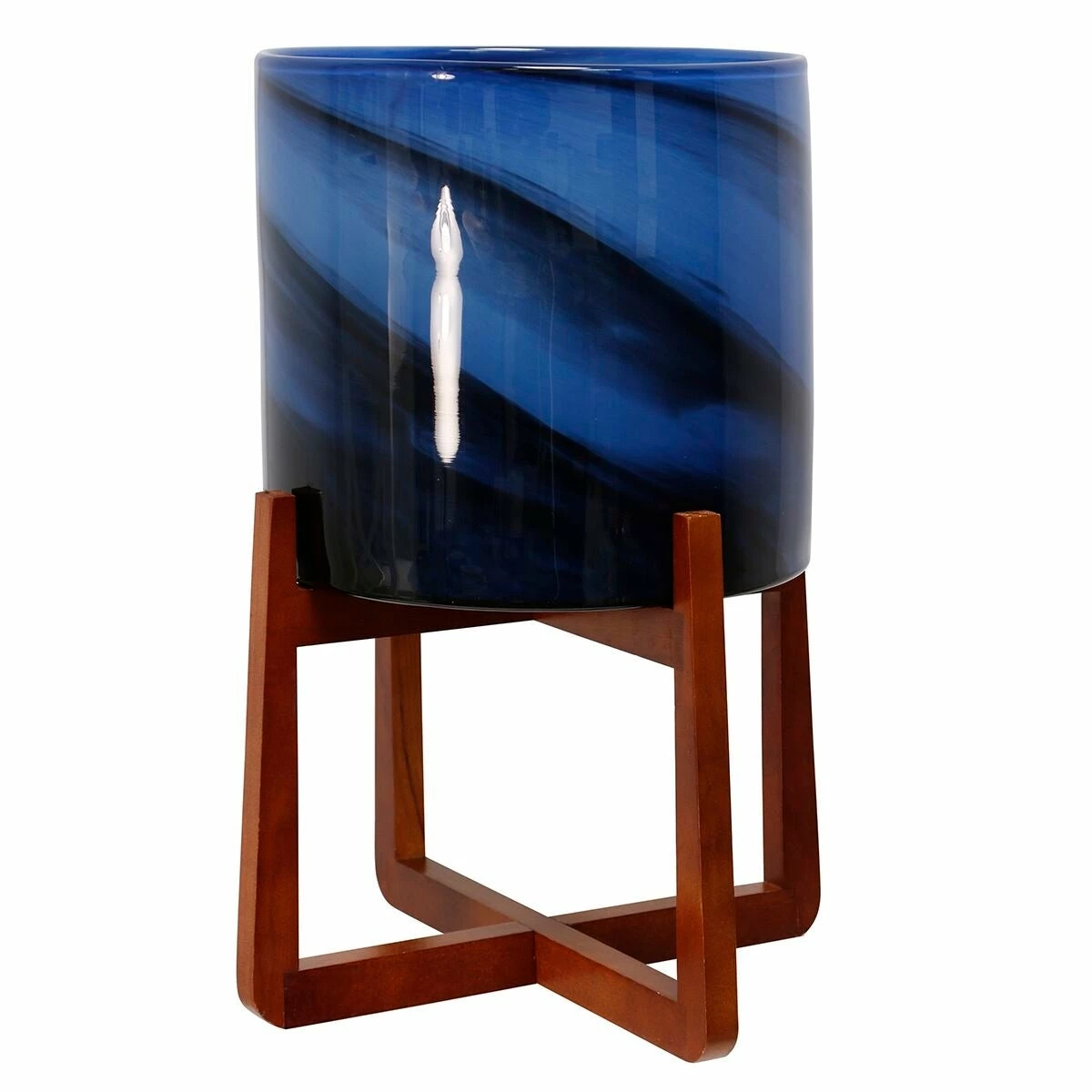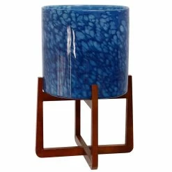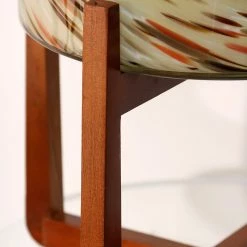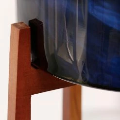 The Vivian indoor/outdoor glass planter makes a stunning addition to any home or patio. Shades of royal blue, green, black, and white are handblown, in a swirling pattern, around the art glass planter creating a unique one-of-a-kind piece. Set within a warm brown wood stand, the planter is the perfect way to add artificial or real greenery to your space.