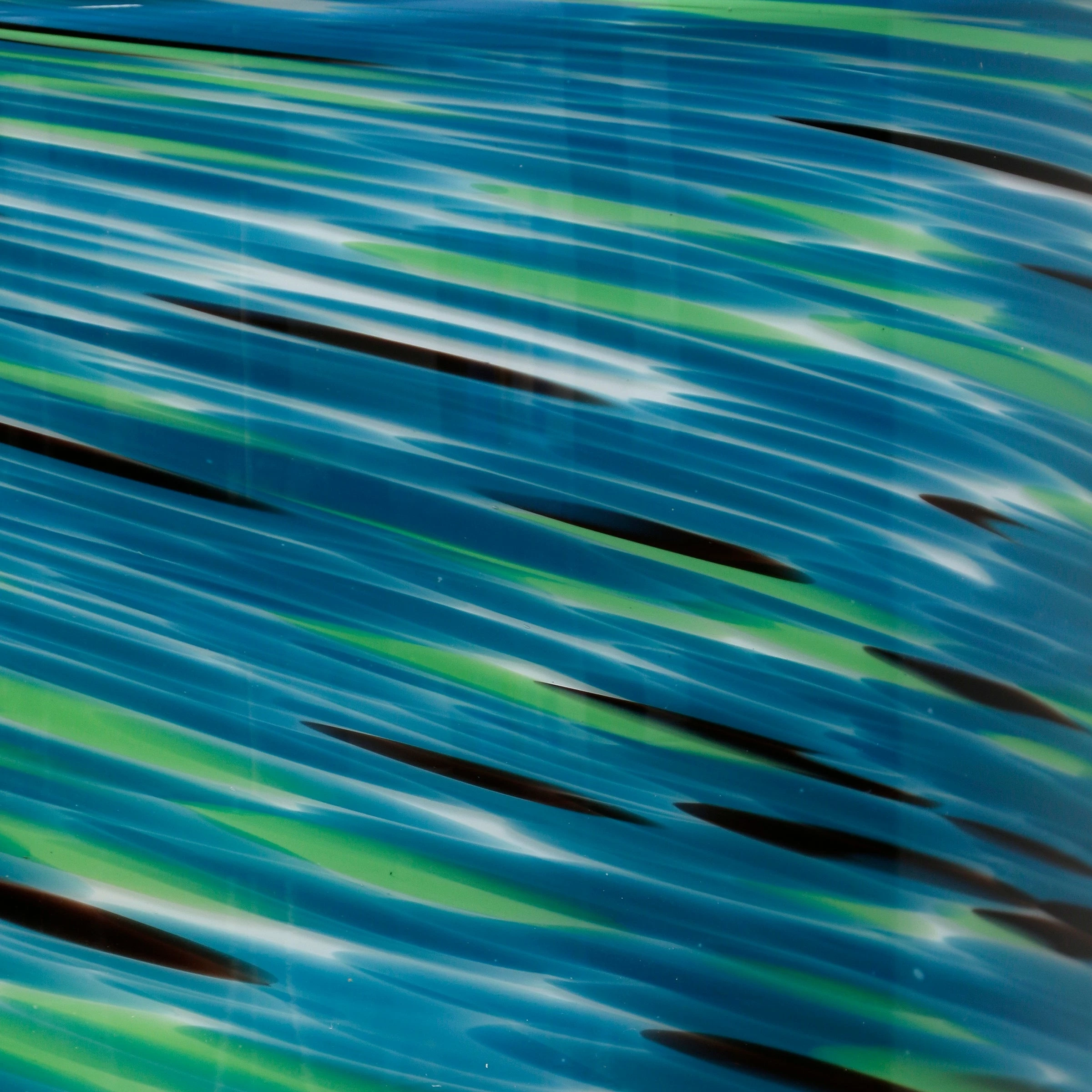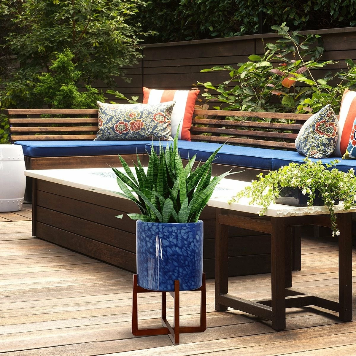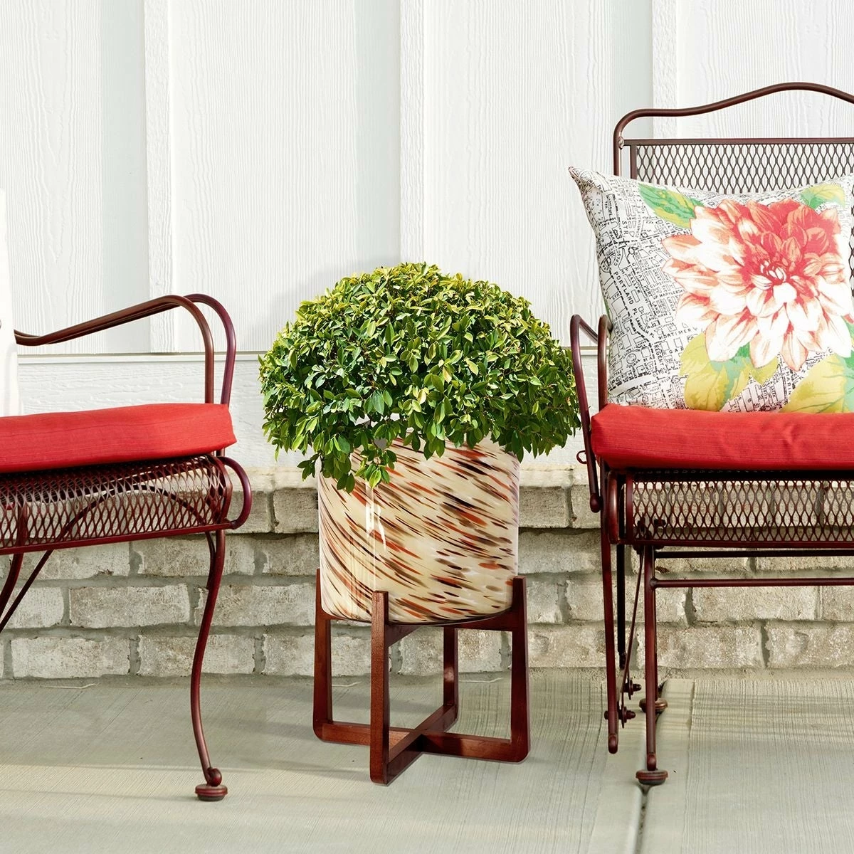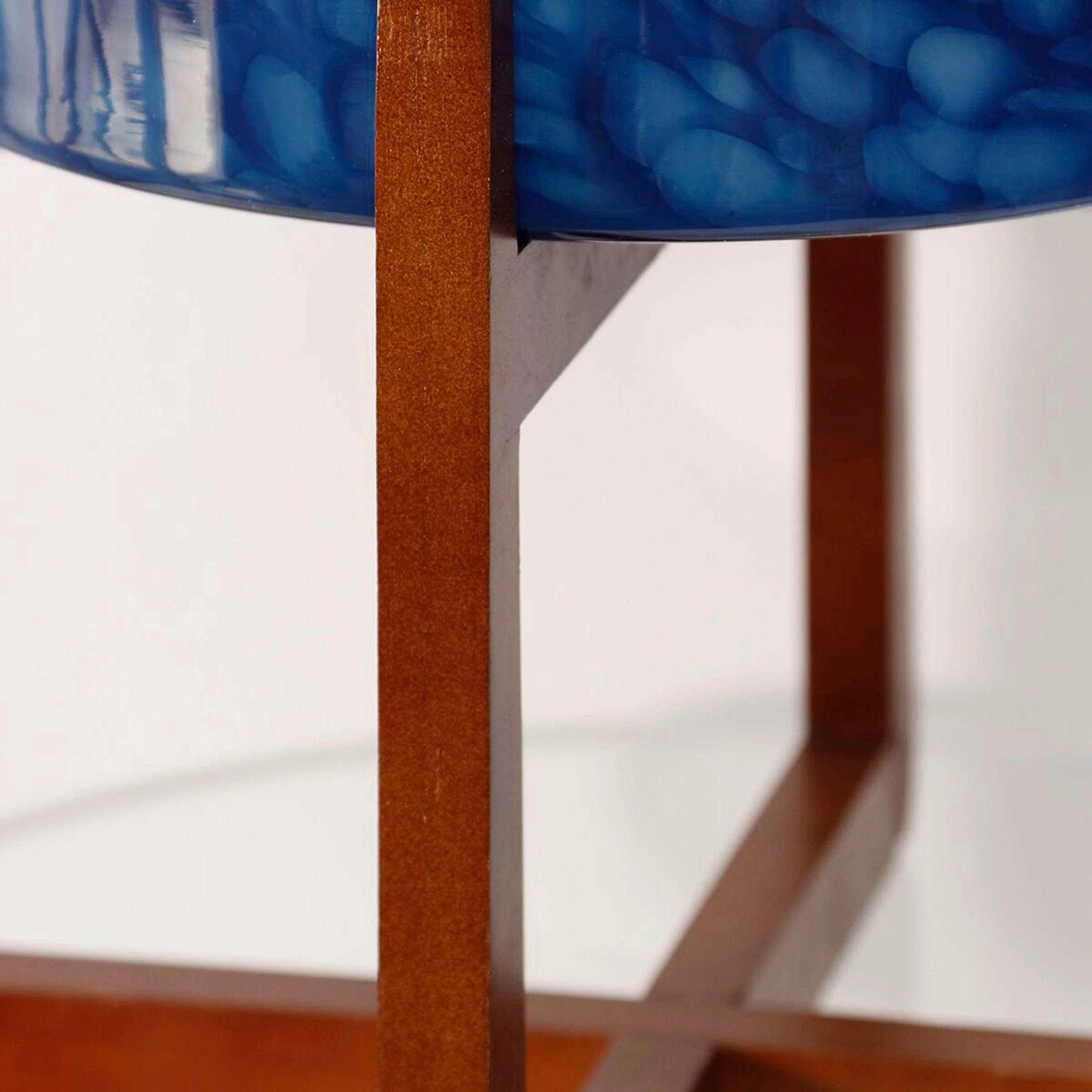 The Vivian indoor/outdoor glass planter makes a stunning addition to any home or patio. Shades of royal blue, green, black, and white are handblown, in a swirling pattern, around the art glass planter creating a unique one-of-a-kind piece. Set within a warm brown wood stand, the planter is the perfect way to add artificial or real greenery to your space.