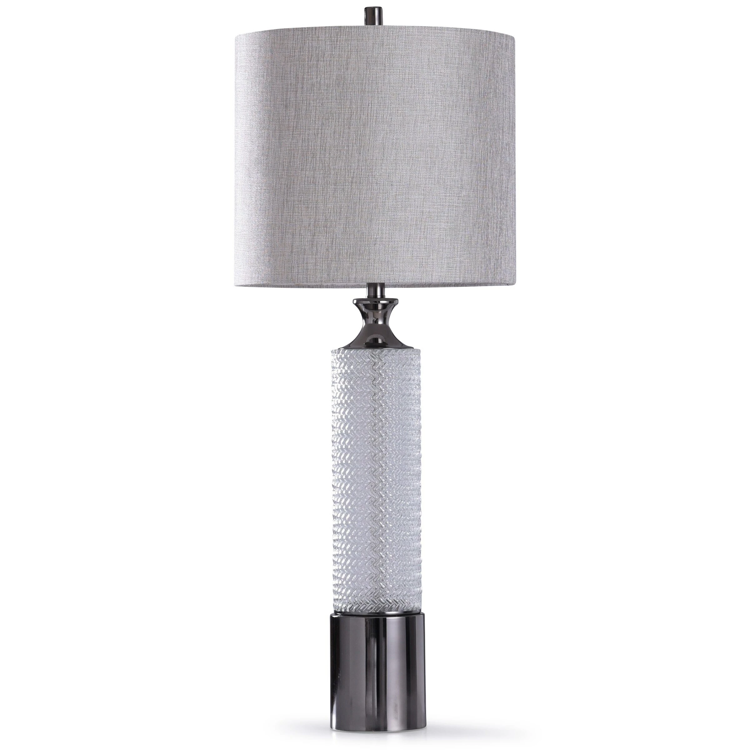 A striking transitional table lamp showcases an effective mix of materials. Using a herringbone glass body with a gorgeous steel base, the frame presents an appealing two-tone effect. The designer grey shade features a mix of rayon and polyester and adds an exquisite accent. This lamp brings overt glam style to modern dining rooms, living rooms and foyers.ย