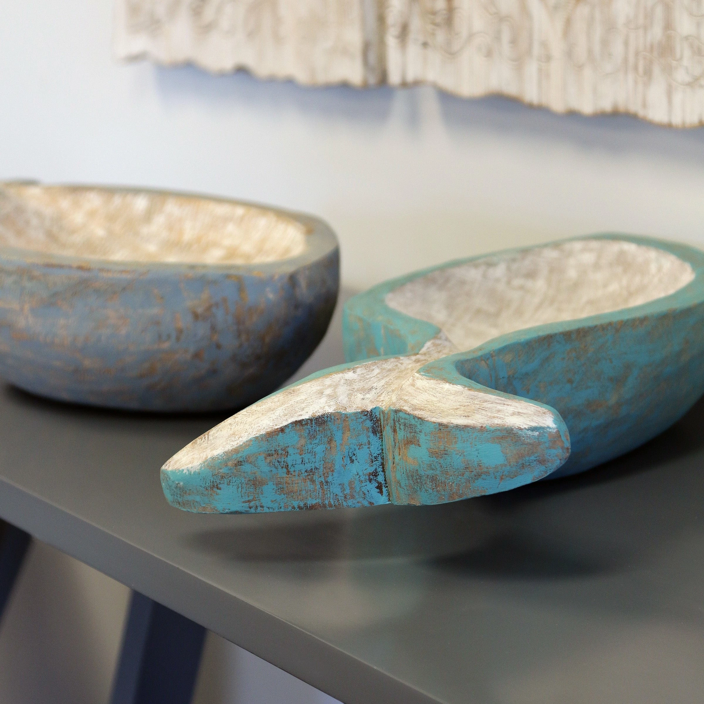 This coastal-inspired carved wooden fish shaped bowl is a great whimsical option for placing party favors and knick-knacks alike. It has a washed gray finish, inviting a softly distressed look to this piece. This bowl is suitable for just about any room, from the home office to the bathroom.