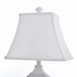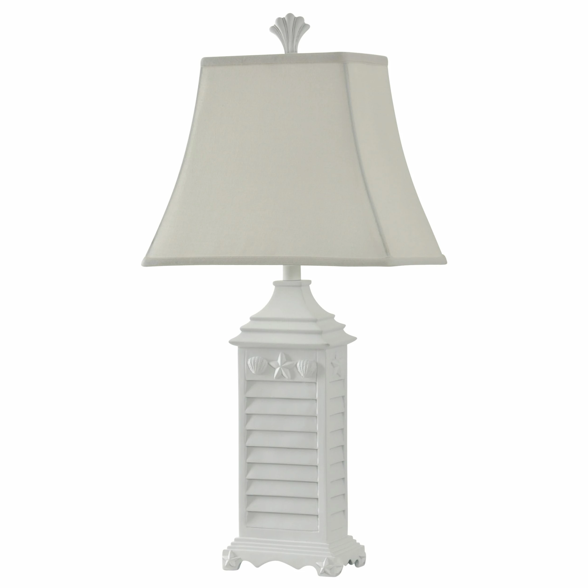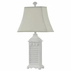 Favor soft, nautical style with this ocean-inspired table lamp. Poly body construction renders the square shutter-style design in crisp detail while offering durability, and the overall white finish adds a light design while pairing with other colors and decor pieces easily. The squared white softback fabric shade features subtle curving at the bottom for a final touch.